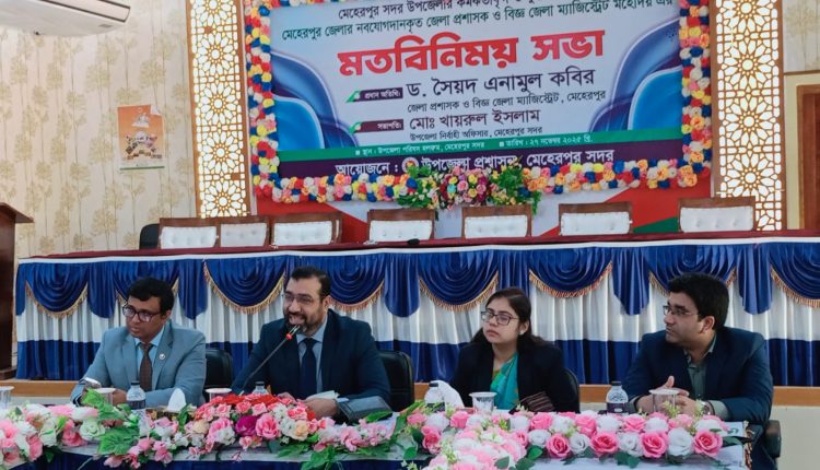 মেহেরপুর প্রতিনিধি:মেহেরপুর সদর উপজেলা প্রশাসনের আয়োজনে আজ সকাল ১১টায় উপজেলা হল রুম কর্মকর্তাবৃন্দ ও সুধীজনদের সাথে মতবিনিময় সভা অনুষ্ঠিত হয়। সভায় মেহেরপুর জেলার নবযোগদানকৃত জেলা প্রশাসক ও জেলা ম্যাজিস্ট্রেট ড. সৈয়দ এনামুল কবির গুরুত্বপূর্ণ দিকনির্দেশনা প্রদান করেন।
