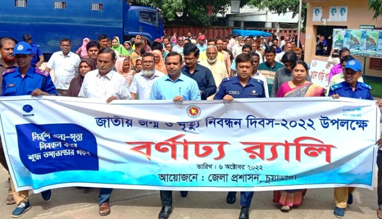 চুয়াডাঙ্গায় জাতীয় জন্ম ও মৃত্যু নিবন্ধন দিবস উপলক্ষে র‌্যালি ও আলোচনাসভা অনুষ্ঠিত হয়েছে। দিবসটি উপলক্ষে গতকাল বৃহস্পতিবার সকাল ১০টায় জেলা প্রশাসকের কার্যালয় চত্বর থেকে একটি র‌্যালি বের করা হয়। র‌্যালিটি শহরের প্রধান প্রধান সড়ক প্রদক্ষিণ শেষে একই স্থানে এসে শেষ হয়। পরে জেলা প্রশাসকের সম্মেলন কক্ষে আলোচনা সভার আয়োজন করা হয়। এতে সভাপতিত্ব করেন চুয়াডাঙ্গার অতিরিক্ত জেলা প্রশাসক (সার্বিক) ও স্থানীয় সরকার বিভাগের ভারপ্রাপ্ত উপপরিচালক সাজিয়া আফরীন। প্রধান অতিথি ছিলেন জেলা প্রশাসক মোহাম্মদ আমিনুল ইসলাম। বিশেষ অতিথি ছিলেন অতিরিক্ত পুলিশ সুপার (প্রশাসন) আবু তারেক, চুয়াডাঙ্গা পৌরসভার মেয়র জাহাঙ্গীর আলম মালিক, জেলা পরিবার পরিকল্পনা অধিদপ্তরের উপ-পরিচালক দীপক কুমার সাহা প্রমুখ। এ সময় আরও উপস্থিত ছিলেন চুয়াডাঙ্গা সদর উপজেলার গড়াইটুপি ইউপি চেয়ারম্যান শফিকুল ইসলাম রাজু, বেগমপুর ইউপি চেয়ারম্যান আলী হোসেন, জেলা প্রশাসনের অন্যান্য কর্মকর্তাবৃন্দ, বিভিন্ন ইউনিয়নের সচিব, ইউপি সদস্যসহ আরও অনেকে।