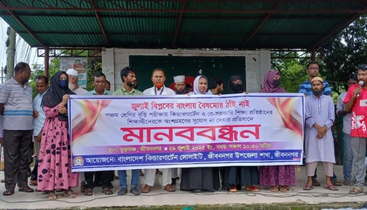 জীবননগর ব্যুরো: ‘জুলাই বিপ্লবের বাংলায়, বৈষম্যের ঠাঁই নাই’ এই প্রতিপাদ্যকে সামনে রেখে কোমলমতি ছাত্র-ছাত্রীদের বৃত্তি পরীক্ষায় অংশগ্রহণের দাবিতে মানববন্ধন ও বিক্ষোভ সমাবেশ অনুষ্ঠিত হয়েছে। জীবননগর কিন্ডারগার্টেন অ্যাসোসিয়েশন উপজেলা শাখার আয়োজনে গতকাল মঙ্গলবার সকাল সাড়ে ১০টায় জীবননগর বাসস্ট্যান্ড মুক্ত মঞ্চে মানববন্ধন ও বিক্ষোভ কর্মসূচি অনুষ্ঠিত হয়। অনুষ্ঠানে বক্তারা বলেন, ২০০৯ সাল থেকে ২০১৯ সাল পর্যন্ত প্রাথমিক শিক্ষা সমাপনি পরীক্ষা এবং কিন্ডারগার্টেন এবং বেসরকারি প্রাথমিক বিদ্যালয়ের শিক্ষার্থীরা নিজ নিজ প্রতিষ্ঠান থেকে বৃত্তি পরীক্ষায় অংশগ্রহণ করে ব্যাপক সাফল্য অর্জন করে আসছে। কিন্তু গত ১৫ জুলাই প্রাথমিক শিক্ষা অধিদপ্তরের নির্বাহী কমিটির সিদ্ধান্ত মোতাবেক ১৭ জুলাইয়ের জারিকৃত পরিপত্রে ২০২৫ সাল হতে কিন্ডারগার্ডেন এবং বেসরকারি প্রাথমিক বিদ্যালয়ের শিক্ষার্থীরা বৃত্তি পরীক্ষায় অংশগ্রহণের ওপর বৈষম্যমূলক নিষেধাজ্ঞা জারি করেছে। এতে করে বাংলাদেশ কিন্ডারগার্টেন অ্যাসোসিয়েশনের প্রায় ৬ লাখ শিক্ষক এবং ৭০ লাখ শিক্ষার্থীর আত্মমর্যাদার ওপর আঘাত হেনেছে যেটা চরম বৈষম্যর শামিল। আমরা এর তীব্র প্রতিবাদ জানিয়ে পরিপত্র বাতিল করে পরীক্ষার সুযোগ না দেয়া হলে দুর্বার আন্দোলন গড়ে তোলা হবে। অ্যাসোসিয়েশনের শিক্ষক এবং শিক্ষার্থীরা বৃত্তির আর্থিক অনুদান নয়, শিশুদের আত্মবিশ্বাস, সামাজিক স্বীকৃতি এবং শিক্ষার অনুপ্রেরণার চরম আঘাতের শামিল। মানববন্ধন ও বিক্ষোভ সমাবেশ কর্মসূচিতে কিন্ডারগার্ডেন অ্যাসোসিয়েশন জীবননগর উপজেলা শাখার সভাপতি ও শিশুকুঞ্জ স্কুলের প্রধান শিক্ষক আব্দুল মোতালেবের সভাপতিত্বে এবং প্রাইড প্রি-ক্যাডেট স্কুলের সহকারী শিক্ষক মামুনের সঞ্চালনায় বক্তব্য রাখেন, উপজেলা কিন্ডারগার্ডেন এসোসিয়েশনের সাধারণ সম্পাদক আবু বকর সিদ্দিক, পৌর কিন্ডার গার্ডেন স্কুলের প্রধান শিক্ষক আলাউদ্দিন, আকলিমা প্রি-ক্যাডেট স্কুলের প্রধান শিক্ষকা রাজিয়া আক্তার রেখা, রাখি প্রি-ক্যাডেট স্কুলের পরিচালক খোকন বিশ্বাস, প্রাইড প্রি-ক্যাডেট স্কুলের পরিচালক মাসুদ পারভেজ রানা, সানফ্লাওয়ার প্রি ক্যাডেট স্কুলের প্রধান শিক্ষক খলিলুর রহমান, অক্সফোর্ড প্রি-ক্যাডেট স্কুলের প্রধান শিক্ষক হাসান, পেয়ারাতলা শিশু একাডেমির পরিচালক সোহেল, আন্দুলবাড়িয়া কলেজিয়েট প্রি ক্যাডেট স্কুলের পরিচালক সোহাগ, দেহাটি মেধাবিকাশ প্রি ক্যাডেট স্কুলের পরিচালক জাহিদুল ইসলাম, উথলী আইডিয়াল প্রি ক্যাডেট স্কুলের ইমরান হোসেন, রায়পুর রোজ কিন্ডারগার্ডেন স্কুলের মিতালী খাতুন প্রমুখ। মানববন্ধনে ২২ টি স্কুলের প্রধান শিক্ষক, সহকারী শিক্ষক ও সকল ছা