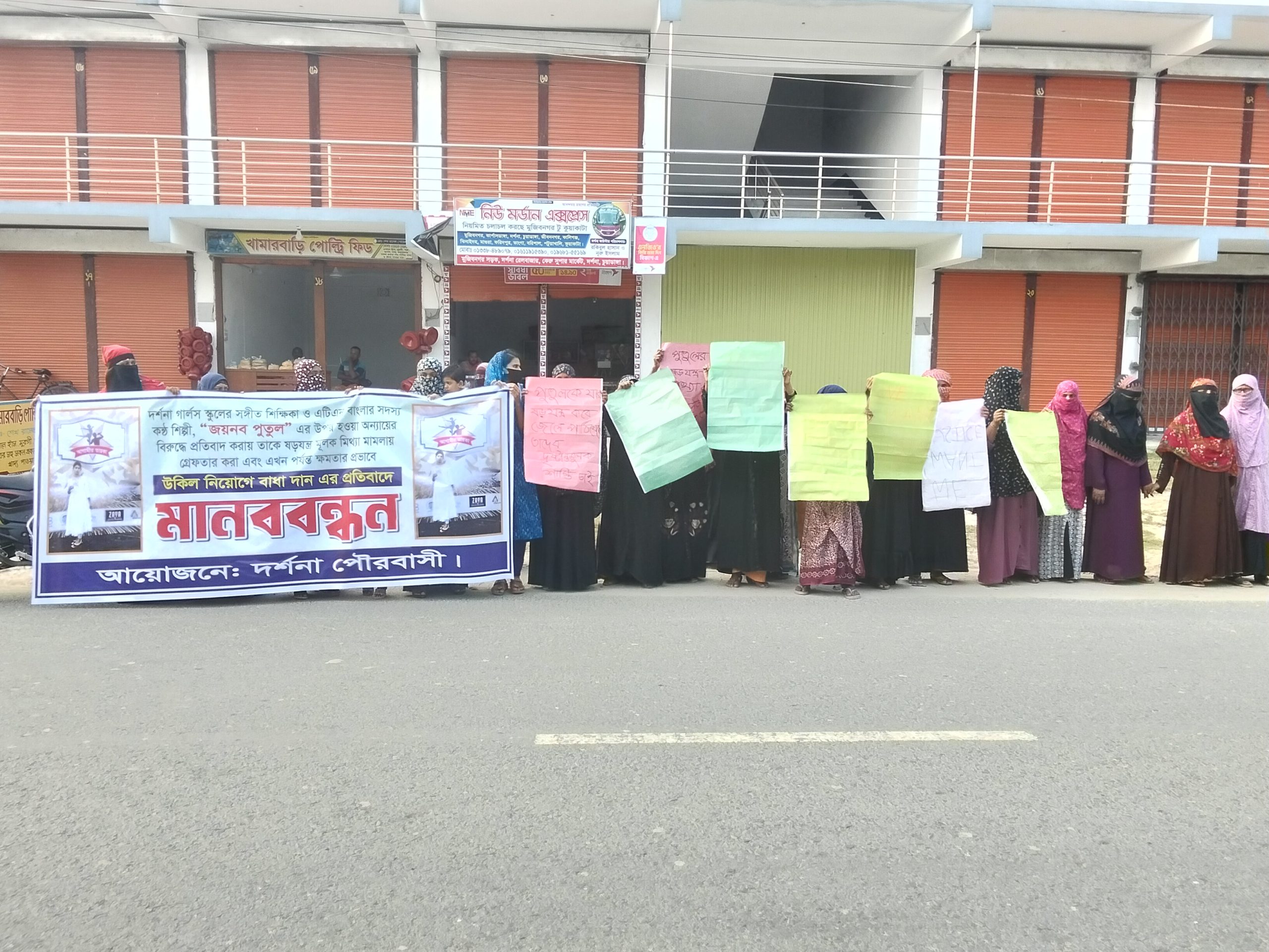 মানববন্ধনটি আয়োজন করে ‘দর্শনা পৌরবাসী’, যারা দাবি করেন, একজন শিল্পী ও শিক্ষিকার বিরুদ্ধে মিথ্যা মামলা দিয়ে তার জীবন ধ্বংস করার চেষ্টা চলছে। আমরা আইনি সহায়তা চাই