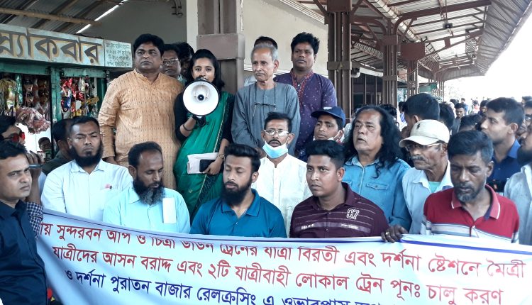 দর্শনা অফিস: দর্শনার জন্য আমরা সংগঠনের পক্ষ থেকে এ শহরের উন্নয়নে বিভিন্ন কর্মসূচি গ্রহণ করেছে। এরই মধ্যে দর্শনা হল্টস্টেশনে সুন্দরবন আপ, চিত্রা ডাউন যাত্রীবাহী ট্রেনের যাত্রাবিরতি, দর্শনা আন্তর্জাতিক রেলস্টেশন থেকে দুটি যাত্রীবাহী ট্রেন পুনঃচালু ব্যবস্থা, মৈত্রী ট্রেনে কোলকাতা-ঢাকাগামী যাত্রীদের আসন বরাদ্দ এবং ওঠা-নামার ব্যবস্থা চালু করতে হবে, দর্শনা পুরাতন বাজার-চুয়াডাঙ্গা-কালিগঞ্জ মহাসড়কে রেলগেটে ওভারপাস ও আন্ডার পাস নির্মাণ, রেলওয়ের নিজস্ব জমিতে (মাদারপাড়া) আধুনিক কইন্টেনার নির্মাণ করতে হবে, দর্শনা-খুলনা ডাবল লাইনের কাজ দ্রুত চালু করতে হবে ও বেনাপোল এক্সপ্রেস ট্রেনে পুণরায় দুটি এসি কোচসহ সাধারণ কোচের সংখ্যা বৃদ্ধি করণসহ টিকিট কালো বাজার রোধ করতে হবে। এ দাবি পূরণে আন্দোলনে মাঠে নেমেছে দর্শনার জন্য আমরা সংগঠনের নেতৃবৃন্দ। গতকাল বুধবার বেলা ১১টার দিকে দর্শনা হল্টস্টেশনে রেলপথ অবরোধ করা হয়। এ সময় সংগঠনের নেতাকর্মীসহ সুধিজনেরাও উপস্থিত ছিলেন। এক পর্যায়ে দামুড়হুদা উপজেলা নির্বাহী অফিসার রোকসানা মিতা ঘটনাস্থলে পৌঁছে আন্দোলনকারীদের আশ্বাস দেন ৬ দফা দাবি পূরণে। এ দাবি জেলা প্রশাসক মহাদোয়কে জানাবেন এবং সংগঠনের পক্ষ থেকে লিখিত দাবি পেশ করার আহ্বান করা হয়। এ সময় উপস্থিত ছিলেন, দর্শনার জন্য আমরা’র আহ্বায়ক আনোয়ারুল ইসলাম বাবু, পারকৃষ্ণপুর-মদনা ইউপি চেয়ারম্যান এসএএম জাকারিয়া আলম, বীর মুক্তিযোদ্ধা জাহাঙ্গীর আলম, হাজি আকমত আলী, ইমরুল কাইয়ূম, কবি ও সাহিত্যিক আবু সুফিয়ান, আবু ফয়সাল, সালাউদ্দিন প্রমুখ।