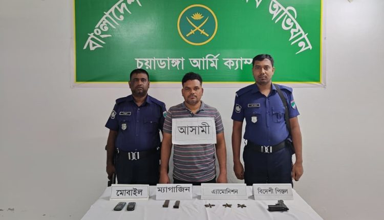 চুয়াডাঙ্গার দামুড়হুদা উপজেলার ব্রীজপাড়া এলাকায় সেনাবাহিনী ও নিরাপত্তা বাহিনীর সমন্বয়ে পরিচালিত একটি সফল অভিযানে উদ্ধার করা হয়েছে একটি বিদেশি পিস্তল, দুটি ম্যাগাজিন ও ১৫ রাউন্ড তাজা গুলি। এ সময় সন্দেহভাজন একজন ব্যক্তিকে আটক করা হয়েছে। গোপন সংবাদের ভিত্তিতে পরিচালিত এই অভিযান ঘিরে এলাকায় ব্যাপক তৎপরতা ও চাঞ্চল্যের সৃষ্টি হয়েছে।