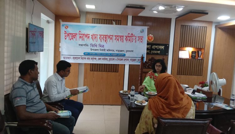 দামুড়হুদা প্রতিনিধি: দামুড়হুদা উপজেলা নিরাপদ খাদ্য ব্যাবস্থাপনা সমন্বয় কমিটির মাসিক সভা অনুষ্ঠিত হয়েছে। গতকাল বুধবার দুপুর সাড়ে ১২ টার দিকে বাংলাদেশ নিরাপদ খাদ্য কর্তৃপক্ষ জেলা কার্যালয় চুয়াডাঙ্গা ও উপজেলা প্রশাসন দামুড়হুদার যৌথ আয়োজনে দামুড়হুদা উপজেলা নির্বাহী কর্মকর্তার কার্যালয়ে এ সভা অনুষ্ঠিত হয়। দামুড়হুদা উপজেলা নির্বাহী কর্মকর্তা তিথি মিত্র’র সভাপতিত্বে নিরাপদ খাদ্য ব্যবস্থাপনা নিয়ে গুরুত্বপূর্ণ আলোচনা করেন চুয়াডাঙ্গা জেলা নিরাপদ খাদ্য অফিসার সজীব পাল। এ সময় উপস্থিত ছিলেন দামুড়হুদা উপজেলা সহকারী কমিশনার (ভূমি) কে এইচ তাসফিকুর রহমান, উপজোলা স্বাস্থ্য ও পরিবার পরিকল্পনা কর্মকর্তা হেলেনা আক্তার নিপা, সমাজসেবা কর্মকর্তা তোফাজ্জল হক, অতিরিক্ত কৃষি কর্মকর্তা অভিজিৎ কুমার বিশ্বাস, উপজেলা খাদ্য কর্মকর্তা দেলোয়ার হোসেন, মৎস্য কর্মকর্তা বিল্লাল হোসেন, দামুড়হুদা প্রেসক্লাবের সভাপতি শামসুজ্জোহা পলাশ প্রমুখ।