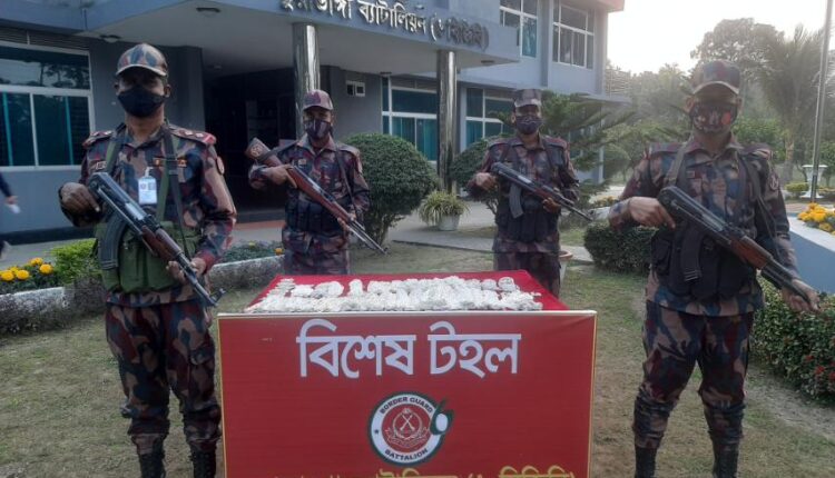 দামুড়হুদা অফিস: চুয়াডাঙ্গা-৬ বিজিবি দামুড়হুদার বিভিন্ন সীমান্ত এলাকায় চোরাচালান ও মাদকবিরোধী অভিযান চালিয়ে ১৬ কেজি ৬৫০ গ্রাম (১৪২৭.৪৬ ভরি) ভারতীয় রূপার গয়নাসহ ফেনসিডিল, গাঁজাসহ বিভিন্ন ধরনের মালামাল জব্দ করেছে। গত ১৩ ফেব্রুয়ারি থেকে গতকাল শনিবার (১৯ ফেব্রুয়ারি) পর্যন্ত উপজেলার বিভিন্ন সীমান্ত এলাকায় অভিযান চালিয়ে এসব মালামাল জব্দ করা হয়। এসময় শাহারুল ইসলাম (৩২) নামের এক মাদক কারবারিকে আটক করা হয়। আটককৃত শাহারুল মেহেরপুর জেলার হরিপুর গ্রামের কুদ্দুস আলীর ছেলে।