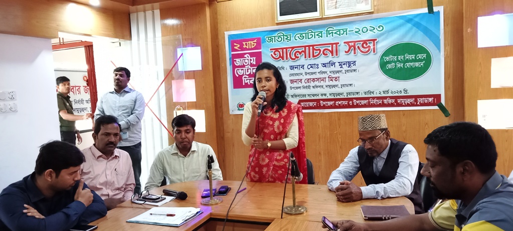 চুয়াডাঙ্গা সদর উপজেলা নির্বাচন অফিসার উপস্থাপিত সভায় বিশেষ অতিথি হিসেবে উপস্থিত থেকে বক্তব্য রাখেন চুয়াডাঙ্গা অতিরিক্ত জেলা প্রশাসক (রাজস্ব) আরাফাত রহমান ও সরকারি কলেজের অবসরপ্রাপ্ত অধ্যক্ষ সিদ্দিকুর রহমান। এছাড়াও বক্তব্য রাখেন চুয়াডাঙ্গা প্রেসক্লাবের সভাপতি দৈনিক মাথাভাঙ্গা সম্পাদক সরদার আল আমিন, সরকারি কলেজের রোভার স্কাউট সদস্য আল মোতাকাব্বির সাকিব ও সরকারি মহিলা কলেজের শিক্ষার্থী মোছা. সুমাইয়া খাতুন। আলোচনা সভার শুরুতে পবিত্র কোরআন থেকে তেলওয়াত করেন ক্বারী কবীর হোসেন ও পবিত্র গিতা থেকে পাঠ করেন বাবু সুনীল মল্লিক।