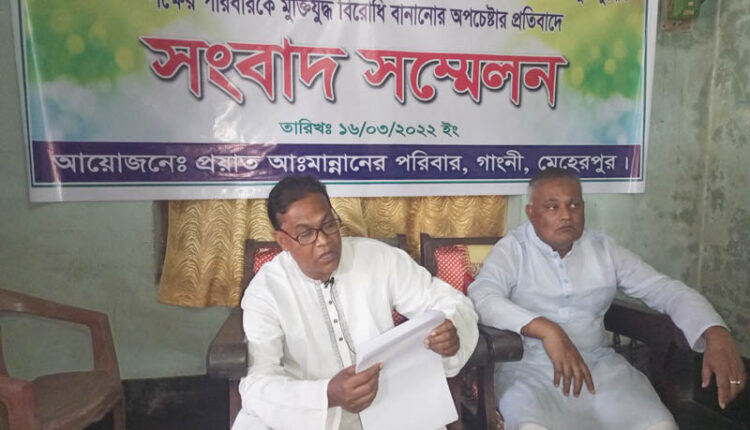 লিখিত বক্তব্যে আব্দুল মান্নানের মেজ ছেলে ধানখোলা ইউনিয়ন আওয়ামী লীগের সাধারণ সম্পাদক আক্তারুজ্জামান বাবু লিখিত বক্তব্য পাঠ করেন। বক্তব্যে তিনি বলেন, মুক্তিযুদ্ধভিত্তিক গ্রন্থ বাংলাদেশের মুক্তিযুদ্ধ, মেহেরপুর জেলা শিরোনামের বইটি রচনা করেছেন গাংনীর কথা সাহিত্যিক রফিকুর রশিদ রিজভী। বইটির প্রকাশক ওসমান গনি। বইটি আগামী প্রকাশনী হতে প্রথম প্রকাশিত ২০০৭ সালে। এ বইয়ে ২৭৬ পাতায় লিপিবদ্ধ করেন এবং পরিশিষ্ট ঘ ২৮৭ পাতাতে বলা হয়, মেহেরপুর জেলার স্বাধীনতা বিরোধী ব্যক্তিদের ভূমিকা প্রসঙ্গে ৬ষ্ঠ লাইনে অবরুদ্ধ বাংলাদেশে অনেক মানুষ ইচ্ছার বিরুদ্ধেও এইসব অত্যাচারী বাহিনীতে নাম লেখাতে বাধ্য হয়েছে। নি¤েœর তালিকায় তাদের নামের পাশে তারকা চিহ্নিত হয়েছে উল্লেখ করে। মেহেরপুর জেলার শান্তি কমিটির সদস্যদের তালিকা মেহেরপুর সদর থানা ক্রঃ নং১-৯৩ পর্যন্ত এবং গাংনী থানা ক্রঃ নং১-১১৫ পর্যন্ত লিপিবদ্ধ করেন। গাংনী থানার শান্তি কমিটির সদস্যদের মধ্যে ক্রমিক ৯২ আব্দুল মান্নান, পিতা- এরশাদ আলী, আড়পাড়া উল্লেখ করেছেন। পূনঃ পরিশিষ্টর ৩০৫ পাতাতে স্টার চিহ্নিত ব্যক্তিদের রাজাকার পরিচয় নিয়ে এলাকায় ভিন্নমত আছে উল্লেখ করেছেন।  তারা আরও দাবি করেন কোন যাছাই ব্যতীত, নিজ এলাকার মানুষ হিসেবে শত্রæতার কারণে অত্র প্রকারে আব্দুল মান্নান এর নাম স্টার চিহ্নিত করে লিখে মুদ্রণ এবং প্রকাশ করা হয়েছে। এ বিষয়ে সরকারি কোনো গেজেট বা জেলার সরকারি কোনো দপ্তর হতে আব্দুল মান্নানের বিরুদ্ধে এধরনের কোন তথ্য প্রকাশ ব্যতীত মিথ্যা তথ্য সম্বলিত বই প্রকাশ করে মানহানি করেছেন। এই বইয়ের লেখায় প্রয়াত আব্দুল মান্নান পরিবার ব্যক্তি, সামাজিক ও পারিবাড়িক জীবনে সম্মানীহানি হয়েছে। অতএব আগামী ৭দিনের মধ্যে বিষয়টি সুরাহা না হলে আইনগত ব্যবস্থা নেয়া হবে বলে সংবাদ সম্মেলনে জানান ভুক্তভোগী পরিবারের সদস্যরা।