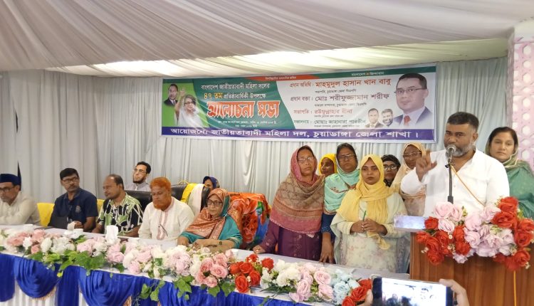 স্টাফ রিপোর্টার:বাংলাদেশ জাতীয়তাবাদী মহিলা দলের ৪৭তম প্রতিষ্ঠাবার্ষিকী উপলক্ষে চুয়াডাঙ্গা জেলা মহিলা দলের উদ্যোগে এক আলোচনা সভা ও দোয়া মাহফিল অনুষ্ঠিত হয়েছে। মঙ্গলবার ৯ সেপ্টেম্বর চুয়াডাঙ্গা চেম্বার অব কমার্স ভবনে এ উপলক্ষে আয়োজিত অনুষ্ঠানে সভাপতিত্ব করেন জেলা মহিলা দলের সভাপতি রওফ উন নাহার রিনা।