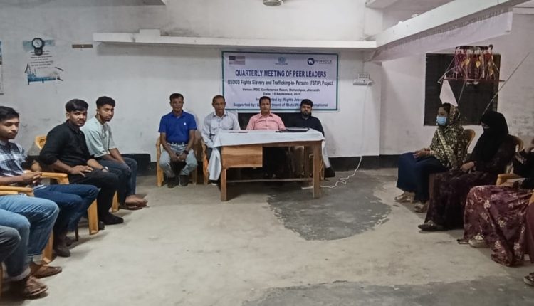 সোমবার সকাল ১০ টা থেকে বিকাল ৪ টা পর্যন্ত আরডিসি হলরুমে এই সভা অনুষ্ঠিত হয়। সকালে পিয়ার লিডার ত্রৈমাসিক সমন্বয় সভার শুভ সূচনা করেন রাইটস যশোরের প্রোগ্রাম ম্যানেজার এস.এম আজহারুল ইসলাম। সভায় স্বাগত বক্তব্য রাখেন,রাইটস যশোরের প্রোগ্রাম অফিসার তপন কুমার বিশ^াস। আরো উপস্থিত ছিলেন,রাইটস যশোরের প্রশাসনিক কর্মকর্তা মীর আবিদ আলী,মনিটিং অফিসার মোস্তাক আহম্মেদ। সভায় মানবপাচার প্রতিরোধ,নিরাপদ অভিবাসন নিশ্চিতকরণ,বাল্যবিবাহ প্রতিরোধ এবং ঝুকিপূর্ণ জনগোষ্ঠী চিহ্নিতকরণ বিষয়ে বিস্তারিত আলোচনা হয়। সভায় মহেশপুর উপজেলার শ্যামকুড়, নেপা,কাজিরবেড় এবং যাদবপুর ইউনিয়ন থেকে মোট ২৪ জন সেচ্ছাসেবী অংশগ্রহণ করেন। অনুষ্ঠানটি পরিচালনা করেন রাইটস যশোরের প্রোগ্রাম অফিসার সুদীপ মন্ডল।