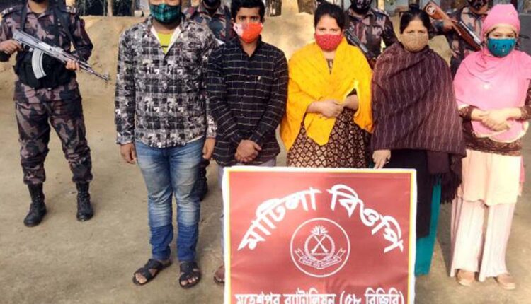বিজিবি’র প্রেস রিলিজ সূত্রে প্রকাশ, ৫৮ বিজিবি’র অধীনস্ত মাটিলা বিওপি’র টহল দল গোপনসূত্রে অভিযান চালিয়ে উপজেলার বেলেঘাট মাঠের ভেতর থেকে তাদেরকে আটক করে। আটককৃতরা হলেন, নরসিংদী জেলার লক্ষ্মীপুরা থানার খাশাউল্লাহ গ্রামের সোনা মিয়ার ছেলে সাইফুল ম-ল (২৮), সাইফুলের স্ত্রী মাসুদা ম-ল (২৬) এবং তাদের শিশু সাকিবুল (০৪) ও সুরাইয়া (০২), একই জেলার সদর থানার সঙ্গীতা গ্রামের ইসমাইলের ছেলে আলামিন (৩১), আলামিনের স্ত্রী কারিমা বেগম (২২) ও শিশু কন্যা আলেয়া (০২), সুরুজ মিয়ার মেয়ে রিনা বেগম (৪০)।