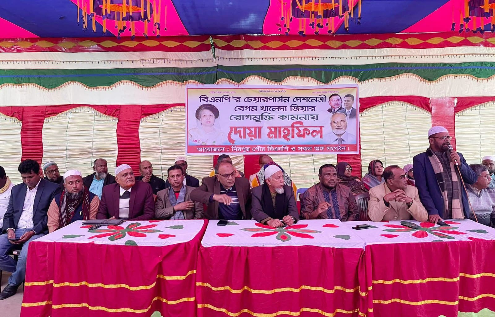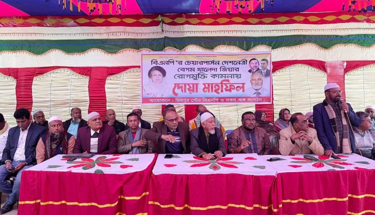 কুষ্টিয়া প্রতিনিধি:কুষ্টিয়া-২ (মিরপুর-ভেড়ামারা আসনের তিনবারের নির্বাচিত সাবেক সংসদ সদস্য, জেলা বিএনপি’র সাবেক সভাপতি, বিএনপি জাতীয় নির্বাহী কমিটির অন্যতম সদস্য ও সংস্কৃতিক বিষয়ক মন্ত্রণালয়ের সাবেক সভাপতি বীর মুক্তিযোদ্ধা আলহাজ্ব অধ্যাপক শহিদুল ইসলামের নির্দেশনায় কুষ্টিয়ার মিরপুর উপজেলার মিরপুর পৌর বিএনপি ও অঙ্গসহযোগী সংগঠন কর্তৃক আয়োজিত যোগীপোল নূরানী হাফেজিয়া মাদ্রাসা প্রাঙ্গণে বিএনপি চেয়ারপারসন দেশনেত্রী বেগম খালেদা জিয়ার রোগমুক্তি ও সুস্থতা কামনায় বিশেষ দোয়া মাহফিল অনুষ্ঠিত হয়েছে। পৌর বিএনপি’র সভাপতি আব্দুর রশিদের সভাপতিত্বে বক্তব্য রাখেন, উপজেলা বিএনপি’র সভাপতি হাজী আশরাফুজ্জামান শাহীন, সাংগঠনিক সম্পাদক এনামুল হক বাবু, সাবেক প্রচার সম্পাদক বিল্লাল হোসেন, উপজেলা যুবদলের সাবেক সভাপতি আজাদুর রহমান (আজাদ) বিশ্বাস, উপজেলা যুবদলের আহবায়ক সুলতান আলী, বহলবাড়ীয়া ইউনিয়ন বিএনপি’র সাধারণ সম্পাদক মাহবুব আলম হারছেন, জেলা যুবদলের সাবেক সহ-সভাপতি এমদাদুল হক এমদাদ ও উপজেলা মহিলাদলের আহবায়ক সাজেদা রশিদ। এসময় অন্যান্য’র মধ্যে উপস্থিত ছিলেন, উপজেলা বিএনপি’র সাবেক দপ্তর সম্পাদক মারফত আফ্রিদী, পৌর বিএনপি’র সাবেক সাংগঠনিক সম্পাদক হাফিজুর রহমান বাবু, বারুইপাড়া ইউনিয়ন বিএনপি’র সভাপতি খন্দকার লুৎফর রহমান, সাধারণ সম্পাদক রবিউল ইসলাম মুকুল, যুগ্ম সাধারণ সম্পাদক মাসুদুল হক খান মাসুদ, তালবাড়ীয়া ইউনিয়ন বিএনপি’র সভাপতি খলিলুর রহমান জোয়ার্দ্দার, সাধারণ সম্পাদক সাইফুল ইসলাম কবিরাজ, ফুলবাড়ীয়া ইউনিয়ন বিএনপি’র ভারপ্রাপ্ত সভাপতি আনিছুর রহমান আনিচ, সাধারণ সম্পাদক হাবিবুর রহমান হাবিব, সাংগঠনিক সম্পাদক আমজাদ হোসেন, বিএনপি নেতা তৈয়ব আলী, উপজেলা যুবদলের যুগ্ম আহবায়ক মনোয়ার হোসেন, উপজেলা স্বেচ্ছাসেবক দলের সদস্য সচিব জাহিদ হাসান, পৌর যুবদলের আহবায়ক সংগ্রাম খান জিল্লু, যুগ্ম আহবায়ক নাসিরুজ্জামান রানা, উপজেলা মহিলা নেত্রী শারমিন সুলতানা সীমা, বিএনপি নেতা শাহাদৎ হোসেন, উপজেলা ছাত্রনেতা ফরিদুল ইসলাম ফরিদ প্রমুখ। দোয়া পরিচালনা করেন, অত্র মাদরাসার শিক্ষক শাহীন আলী।