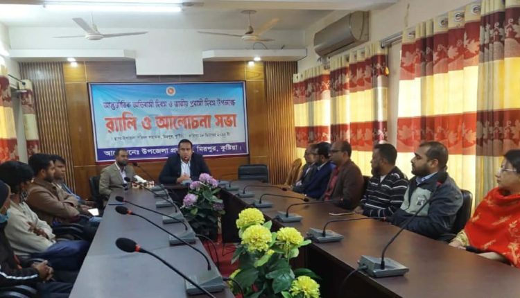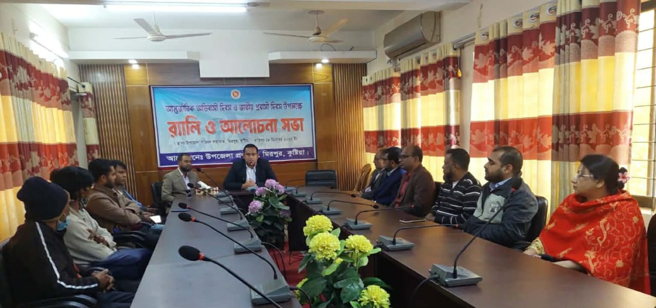 কুষ্টিয়া প্রতিনিধি: কুষ্টিয়ার মিরপুরে আন্তর্জাতিক অভিবাসী দিবস ও জাতীয় প্রবাসী দিবস পালিত হয়েছে। এ উপলক্ষে উপজেলা প্রশাসনের উদ্যোগে এক বর্নাঢ্য র্যালি বের হয়ে শহরের প্রধান প্রধান সড়ক প্রদক্ষিণ করেন। পরে উপজেলা সভাকক্ষে এক আলোচনা সভা অনুষ্ঠিত হয়। উপজেলা নির্বাহী কর্মকর্তা নাজমুল ইসলামের সভাপতিত্বে এ সময়ে উপজেলা সমাজসেবা কর্মকর্তা জামশেদ আলী, উপজেলা শিক্ষা কর্মকর্তা গোলাম মহিউদ্দিন, উপজেলা রিসোর্স সেন্টারে ইন্সট্রাক্টর জামাল হোসেন, উপজেলা যুব উন্নয়ন কর্মকর্তা বদিউজ্জামান, উপজেলা পরিসংখ্যান কর্মকর্তা ইশরাক রহমান, উপজেলা মাধ্যমিক শিক্ষা অধিদপ্তরের একাডেমিক সুপারভাইজার জুলেখা খাতুন, উপজেলা আনসার ও ভিডিপি কর্মকর্তা খানে আলম খান, উপজেলা পরিচালন ও উন্নয়ন প্রকল্পের ফ্যাসিলিটিটর উত্তম কুমার বিশ্বাস, টিটিসির প্রশিক্ষক শহিদুল ইসলাম, উপসহকারী পাট উন্নয়ন কর্মকর্তা রাশেদ আহমেদ প্রমুখ উপস্থিত ছিলেন।