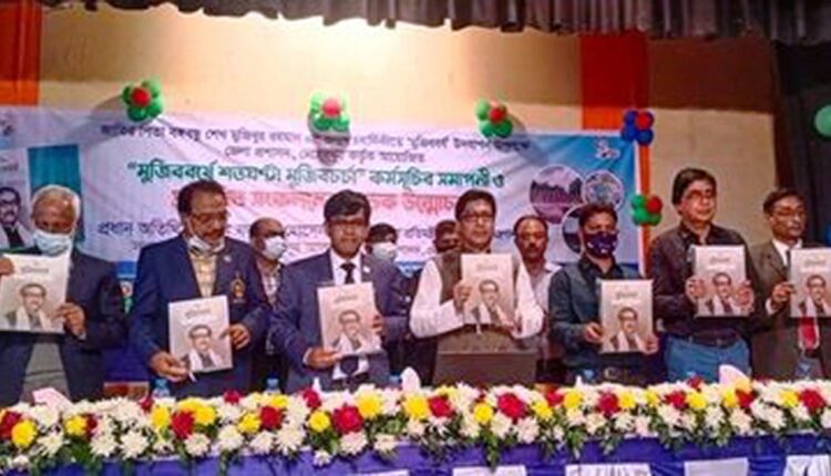 মেহেরপুর অফিস: মেহেরপুর জেলা প্রশাসনের উদ্যোগে ‘মুজিব শতবর্ষে শতঘণ্টা মুজিবচর্চা’ আয়োজনের সমাপনী ও প্রকাশিত সংকলনের মোড়ক উন্মোচন করা হয়েছে। গত শনিবার রাতে মেহেরপুর জেলা শিল্পকলা একাডেমি মিলনায়তনে ‘মুজিব শতবর্ষে শতঘণ্টা মুজিবচর্চা’ আয়োজনের সমাপনী ও প্রকাশিত সংকলনের মোড়ক উন্মোচন করা হয়। জনপ্রশাসন প্রতিমন্ত্রী ফরহাদ হোসেন প্রধান অতিথি হিসেবে উপস্থিত থেকে প্রকাশিত সংকলনের মোড়ক উন্মোচন করেন। জেলা প্রশাসক ড. মুহাম্মদ মুনসুর আলম খানের সভাপতিত্বে সমাপনী ও মোড়ক উন্মোচন অনুষ্ঠানে বিশেষ অতিথি হিসেবে উপস্থিত ছিলেন মেহেরপুর সরকারি কলেজের অধ্যক্ষ প্রফেসর শফিউল আলম সরদার, সরকারি মহিলা কলেজের অধ্যক্ষ প্রফেসর রফিকুল ইসলাম। সহকারী কমিশনার ও নির্বাহী ম্যাজিস্ট্রেট মাসতুরা আমিনার সঞ্চালনায় সমাপনী অনুষ্ঠানে বক্তব্য রাখেন অতিরিক্ত পুলিশ সুপার জামিরুল ইসলাম, মেহেরপুর জেলা বঙ্গবন্ধু শিক্ষা ও গবেষণা পরিষদের সভাপতি প্রফেসর হাসানুজ্জামান মালেক, পাবলিক প্রসিকিউটর পল্লব ভট্টাচার্য, প্রধান শিক্ষক ফৌজিয়া আফরোজ তুলি প্রমুখ। অনুষ্ঠানে অন্যান্যের মধ্যে স্থানীয় সরকার বিভাগের উপ-পরিচালক মৃধা মো. মোজাহিদুল ইসলাম, মেহেরপুর জেলা আওয়ামী লীগের সহসভাপতি আব্দুল হালিম, মেহেরপুর টিটিসির অধ্যক্ষ আরিফ আহমেদ তালুকদার, আমদহ ইউনিয়নের চেয়ারম্যান আনোয়ারুল ইসলাম, প্রধান শিক্ষক তাহাজ উদ্দিন, শিক্ষক নেতা কোমর উদ্দিন প্রমুখ উপস্থিত ছিলেন। পরে প্রকাশিত সংকলনের মোড়ক উন্মোচন করা। এর আগে সেখানে সাংস্কৃতিক অনুষ্ঠান অনুষ্ঠিত হয়।