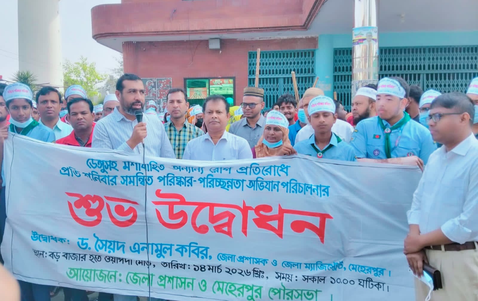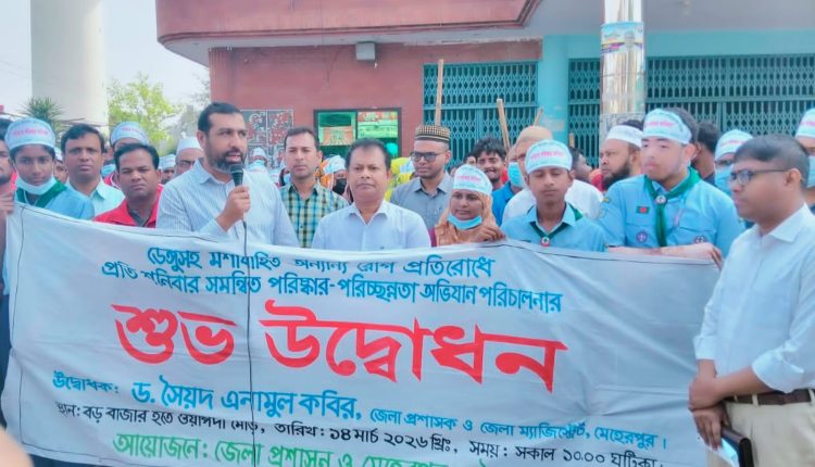 মেহেরপুর প্রতিনিধি:মেহেরপুরে শহরকে পরিচ্ছন্ন রাখতে নজিরবিহীন উদ্যোগ নিয়েছেন জেলা প্রশাসক ড. সৈয়দ এনামুল কবির। রোজা অবস্থায় প্রচণ্ড রৌদ্র উপেক্ষা করে প্রায় পৌনে তিন ঘণ্টা একটানা দাঁড়িয়ে থেকে নিজ হাতে ময়লা পরিষ্কার করে পরিচ্ছন্নতা অভিযানের নেতৃত্ব দেন তিনি।