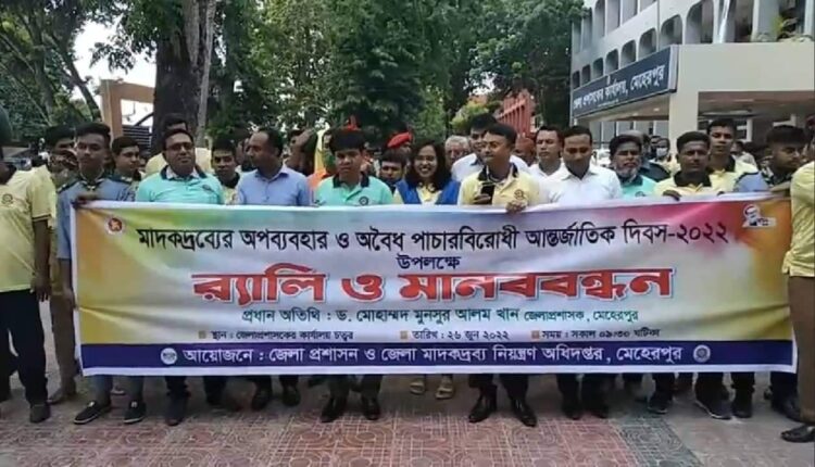 মেহেরপুর অফিস: মেহেরপুরে আন্তর্জাতিক অপব্যবহার ও অবৈধ পাচারবিরোধী দিবস পালিত হয়েছে। গতকাল রোববার সকালে র্যালি, মানববন্ধন ও আলোচনাসভা অনুষ্ঠিত হয়। অতিরিক্ত জেলা প্রশাসক (সার্বিক) নাজমুল হুদার সভাপতিত্বে মেহেরপুর জেলা প্রশাসকের সম্মেলন কক্ষে অনুষ্ঠিত আলোচনাসভায় প্রধান অতিথি ছিলেন জেলা প্রশাসক ড. মোহাম্মদ মুনসুর আলম খান। এতে বিশেষ অতিথি হিসেবে উপস্থিত ছিলেন অতিরিক্ত জেলা প্রশাসক (রাজস্ব) লিংকন বিশ্বাস, অতিরিক্ত পুলিশ সুপার (সার্কেল) অপু সরোয়ার। আলোচনাসভায় স্বাগত বক্তব্য রাখেন মেহেরপুর জেলা মাদকদ্রব্য নিয়ন্ত্রণ অধিদপ্তরের সহকারী পরিচালক শিরিন আখতার। অন্যদের মধ্যে বক্তব্য রাখেন মেহেরপুর জেলা সমাজসেবা অধিদপ্তরের উপ-পরিচালক কাজী কাদের মোহাম্মদ ফজলে রাব্বী, জেলা শিক্ষা অফিসার মাহফুজুল হোসেন, জেলা প্রাথমিক শিক্ষা অফিসার ভবেশ চন্দ্র রঞ্জন রায়, জেলা তথ্য অফিসার আব্দুল্লাহ আল মামুন প্রমুখ। এর আগে মাদকের অপব্যবহার ও অবৈধ পাচার বিরোধী আন্তর্জাতিক দিবস উপলক্ষে মানববন্ধন করা হয়। অতিরিক্ত জেলা প্রশাসক নাজমুল হুদার নেতৃত্বে মেহেরপুর জেলা প্রশাসকের কার্যালয় চত্বরে এ মানববন্ধন অনুষ্ঠিত হয়। এর আগে একটি র্যালি বের করা হয়। জেলা প্রশাসক ড. মোহাম্মদ মনসুর আলম খানের নেতৃত্বে র্যালিটি জেলা প্রশাসকের কার্যালয় চত্বর থেকে শুরু করে প্রধান সড়ক হয়ে উপজেলা গেট থেকে একই স্থানে গিয়ে শেষ হয়।