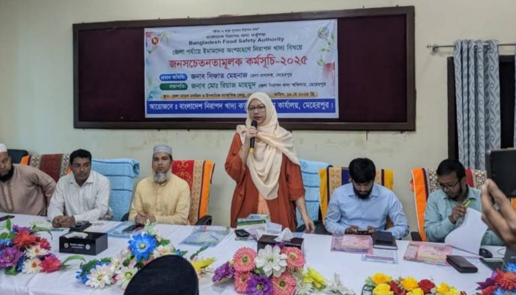 মেহেরপুর অফিস: বাংলাদেশ নিরাপদ খাদ্য কর্তৃপক্ষের মেহেরপুর জেলা শাখার উদ্যোগে ইমামদের নিরাপদ খাদ্য সম্পর্কে সচেতন করার লক্ষ্যে এক আলোচনা সভার আয়োজন করা হয়েছে। সোমবার দুপুরে মেহেরপুর জেলা ইসলামিক ফাউন্ডেশন মিলনায়তনে এ সভা অনুষ্ঠিত হয়। সভায় সভাপতিত্ব করেন জেলা নিরাপদ খাদ্য কর্মকর্তা রিয়াজ মাহমুদ। প্রধান অতিথি ছিলেন জেলা প্রশাসক সিফাত মেহনাজ। সভায় বিশেষ বক্তব্য রাখেন জেলা তথ্য অফিসার আব্দুল্লাহ আল মামুন। এই অনুষ্ঠানে জেলার বিভিন্ন মসজিদের ইমামগণ অংশগ্রহণ করেন। আলোচনা সভায় নিরাপদ খাদ্য সম্পর্কে ইমামদের অবহিত করা হয় এবং এ বিষয়ে জনসচেতনতা বৃদ্ধিতে তাদের ভূমিকার ওপর গুরুত্বারোপ করা হয়।