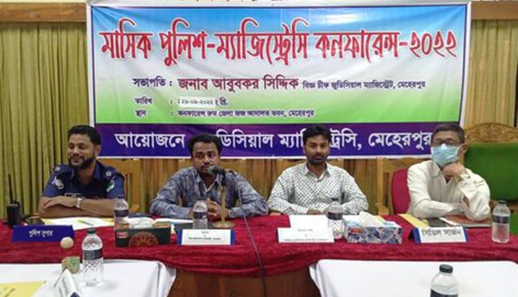মেহেরপুর অফিস: মেহেরপুরে মাসিক পুলিশ-ম্যাজিস্ট্রেসি কনফারেন্স অনুষ্ঠিত হয়েছে। গতকাল সোমবার বিকেলে জুডিসিয়াল ম্যাজিস্ট্রেসি মেহেরপুরের উদ্যোগে জেলা জজ আদালত মিলনায়তনে এ কনফারেন্স অনুষ্ঠিত হয়। চীফ জুডিশিয়াল ম্যাজিস্ট্রেট আবু বকর সিদ্দিক এর সভাপতিত্বে কনফারেন্সে বিশেষ অতিথি হিসেবে উপস্থিত ছিলেন অতিরিক্ত পুলিশ সুপার জামিরুল ইসলাম। কনফারেন্সে অন্যান্যের মধ্যে বক্তব্য রাখেন সিভিল সার্জন ডা.জওয়াহেরুল আনাম সিদ্দিকী, অ্যাড. মীনা পাল, অ্যাড. জিল্লুর রহমান, মেহেরপুর সদর থানার ওসি রফিকুল ইসলাম, গাংনী থানার ওসি আব্দুর রাজ্জাক, মুজিবনগর থানার ওসি মেহেদী রাসেল প্রমুখ। সম্মেলনে বক্তারা বলেন-পুলিশসহ অংশীদারী সব প্রতিষ্ঠানের সঙ্গে ম্যাজিস্ট্রেটগণের সেতুবন্ধন সৃষ্টি করে পুলিশ-ম্যাজিস্ট্রেসি কনফারেন্স। অংশগ্রহণকারী সংশ্লিষ্ট সকলে পারস্পরিক আলাপ-আলোচনার মাধ্যমে প্রতিবন্ধকতা দূর করতে হবে। বিচার বিভাগের সকল অংশীদারদের সঙ্গে আলাপ-আলোচনার মাধ্যমে মানুষের বিচার পাওয়ার অধিকার নিশ্চিত করা সহজ হবে।