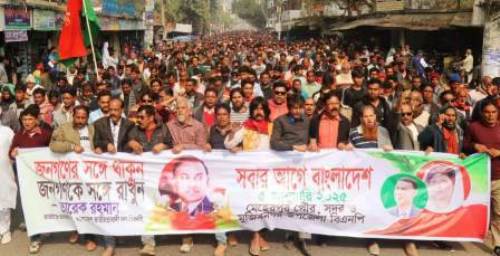 মেহেরপুর অফিস: ‘সবার আগে বাংলাদেশ, জনগণের সঙ্গে থাকুন, জনগণকে সঙ্গে রাখুন’ বিএনপির ভারপ্রাপ্ত চেয়ারম্যান তারেক রহমানের এই স্লোগানকে সামনে রেখে মেহেরপুরে মিছিল ও সমাবেশ করেছে পৌর, সদর উপজেলা ও মুজিবনগর উপজেলা বিএনপি। গতকাল রোববার বেলা সাড়ে ১১টার দিকে মেহেরপুর সরকারি উচ্চ বিদ্যালয় মাঠ প্রাঙ্গণ থেকে বাংলাদেশ জাতীয়তাবাদী দল বিএনপির কেন্দ্রীয় নির্বাহী সদস্য ও মেহেরপুর-১ আসনের সাবেক এমপি মাসুদ অরুনের নেতৃত্বে একটি মিছিল বের হয়ে পৌর শহরের প্রধান প্রধান সড়ক প্রদক্ষিণ করে জেলা প্রশাসক কার্যালয়ের সামনে গিয়ে শেষ হয়। পরে সেখানে সংক্ষিপ্ত সমাবেশ অনুষ্ঠিত হয়। সমাবেশে প্রধান অতিথির বক্তব্যে মাসুদ অরুন বলেন, ষড়যন্ত্র এখনো চলছে। মেহেরপুরে জেলা বিএনপির কমিটি নিয়ে কোনরকম ষড়যন্ত্রকে ছাড় দেয়া হবে না। আপনারা বলেছেন ঘরে বসে কমিটি হবে, এখনই পদ পদবি বিক্রি করছেন। ঘরে বসে কোন কমিটি হবে না। কমিটি হবে প্রকাশ্যে শামসুজ্জোহা পার্কে, জনগণের সামনে। মানুষ উত্তর দেবে, মানুষ জেগেছে মানুষ জাগছে, জনগণের কথা হবে শেষ কথা। এ সময় উপস্থিত ছিলেন মেহেরপুর জেলা বিএনপির আহ্বায়ক কমিটির যুগ্ম আহ্বায়ক ও পৌর বিএনপির সভাপতি জাহাঙ্গীর বিশ্বাস, সদর উপজেলা বিএনপির সাধারণ সম্পাদক সাইফুল ইসলাম, মুজিবনগর উপজেলা বিএনপির সাংগঠনিক সম্পাদক আব্দুর রশিদ, জেলা কৃষকদলের আহ্বায়ক মাহবুবুর রহমান, জেলা যুবদলের সভাপতি জাহিদুল হক জাহিদ, জেলা ছাত্রদলের সভাপতি আকিব জাভেদ সেনজিরসহ মেহেরপুর বিএনপির অঙ্গসংগঠনের নেতৃবৃন্দ। এর আগে মেহেরপুর সরকারি উচ্চ বিদ্যালয় মাঠ প্রাঙ্গনে সমাবেশ করা হয়।