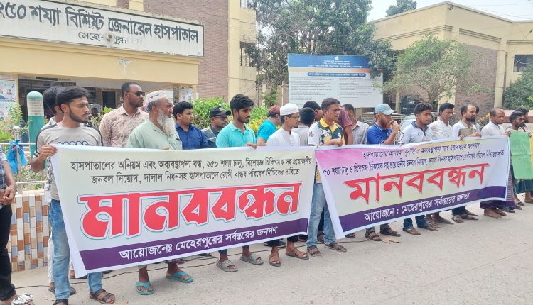 মেহেরপুর অফিস: মেহেরপুর জেনারেল হাসপাতালে দীর্ঘদিনের অনিয়ম, দুর্নীতি ও চরম অব্যবস্থাপনার প্রতিবাদে গতকাল বৃহস্পতিবার বেলা ১১টায় মেহেরপুর ২৫০ শয্যা জেনারেল হাসপাতালের সামনে এলাকাবাসী ও বৈষম্যবিরোধী ছাত্র আন্দোলনের ইউটিউবে মেহেরপুরের সর্বস্তরের জনতার ব্যানারে এই মানববন্ধন অনুষ্ঠিত হয়েছে। মানববন্ধনে বক্তারা হাসপাতালের তত্ত্বাবধায়কের অপসারণ, ২৫০ শয্যার পূর্ণাঙ্গ কার্যক্রম চালুর পাশাপাশি বিশেষজ্ঞ চিকিৎসক ও প্রয়োজনীয় জনবল দ্রুত নিয়োগের দাবি জানান। এছাড়া দালাল চক্র নির্মূল ও রোগীদের জন্য একটি সুশৃঙ্খল ও মানবিক চিকিৎসা পরিবেশ নিশ্চিত করারও আহ্বান জানানো হয়। মানববন্ধনে অংশ নেয়া স্থানীয় এক বক্তা বলেন, ‘এটা আমাদের জেলা সদর হাসপাতাল, অথচ এখানে চিকিৎসা পাওয়া যেন ভাগ্যের ব্যাপার। তত্ত্বাবধায়ক দায়িত্ব পালনের বদলে নিজের সুবিধা নিয়েই ব্যস্ত।’ অন্যান্য বক্তারা অভিযোগ করেন, হাসপাতালে ওষুধ ও চিকিৎসা সরঞ্জামের সংকট, পরিষ্কার-পরিচ্ছন্নতার অভাব, রোগীদের সঙ্গে দুর্ব্যবহার এবং বহিরাগত দালালদের দৌরাত্ম্যে সাধারণ মানুষ নাজেহাল হয়ে পড়েছে। মানববন্ধনে অর্ধ শতাধিক মানুষ অংশ নেন। যাদের মধ্যে ছিলেন বিভিন্ন পেশার প্রতিনিধিরা, নাগরিক সমাজের সদস্য, রোগীর স্বজন ও মানবাধিকারকর্মীরা। তারা হুঁশিয়ারি দিয়ে বলেন, দাবি আদায় না হলে পরবর্তী সময়ে জেলা প্রশাসক বরাবর স্মারকলিপি প্রদানসহ বৃহত্তর আন্দোলনের ডাক দেয়া হবে। এ বিষয়ে হাসপাতাল কর্তৃপক্ষের পক্ষ থেকে এখনো কোনো আনুষ্ঠানিক প্রতিক্রিয়া পাওয়া যায়নি।