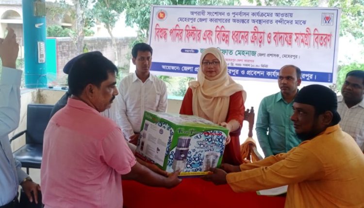 মেহেরপুর অফিস: মেহেরপুর জেলা প্রশাসন ও প্রবেশন কার্যালয়ের উদ্যোগে অপরাধী সংশোধন ও পুনর্বাসন কার্যক্রমের আওতায় মেহেরপুর জেলা কারাগারে অবস্থানরত বন্দিদের মাঝে বিশুদ্ধ পানির ফিল্টার ও বিভিন্ন ধরনের ক্রীড়া ও বাদ্যযন্ত্র সামগ্রী বিতরণ করা হয়েছে। সোমবার সকালে জেলা প্রশাসক সিফাত মেহনাজ প্রধান অতিথি হিসেবে উপস্থিত থেকে এসব সামগ্রী বিতরণ করেন। এ সময় তার সঙ্গে ছিলেন সহকারী কমিশনার ও নির্বাহী ম্যাজিস্ট্রেট নাদির হোসেন শামীম, আবীর আনসারী, জেলার নিজামুদ্দিন, প্রবেশন কর্মকর্তা মিজানুর রহমান এবং উপজেলা সমাজসেবা কর্মকর্তা আনিসুর রহমান প্রমুখ। বন্দিদের শারীরিক ও মানসিক সুস্থতা নিশ্চিত করার লক্ষ্যে এই উদ্যোগ নেয়া হয়েছে বলে জানান সংশ্লিষ্ট কর্মকর্তারা। পরে জেলা প্রশাসক জেলখানা পরিদর্শন করেন এবং কারাগারের বিভিন্ন দিক ঘুরে দেখেন। এর আগে জেলা প্রশাসক কারাগারে পৌঁছালে জেল পুলিশের একটি দল তাকে গার্ড অব অনার প্রদান করে। তিনি গার্ড অব অনার গ্রহণ করেন এবং সংশ্লিষ্টদের সঙ্গে মতবিনিময় করেন।