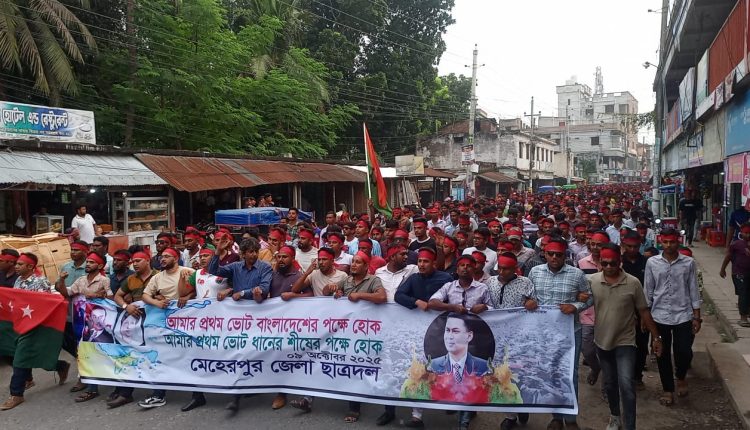 মেহেরপুর অফিস:”আমার প্রথম ভোট বাংলাদেশের পক্ষে হোক, আমার প্রথম ভোট ধানের শীষের পক্ষে হোক”” এই স্লোগানকে সামনে রেখে সমবেশ ও মিছিল করেছে মেহেরপুর জেলা ছাত্রদল। বৃহস্পতিবার বিকালে মেহেরপুর সড়ক বিভাগের সামনে থেকে একটি মিছিল বের হয়ে শহরের প্রধান প্রধান সড়ক প্রদক্ষিণ করে কাথুলি বাসস্ট্যান্ডে গিয়ে শেষ হয়। এর আগে সেখানে সমাবেশ করা হয় সমাবেশ সঞ্চালনা করেন জেলা ছাত্রদলের সিনিয়র যুগ্ম সম্পাদক রাশিদুল ইসলাম রাজন, সভাপতি তো করেন জেলা ছাত্রদলের সভাপতি আকিব জাভেদ সেনজির। এ সময় সেখানে প্রধান অতিথি হিসেবে বক্তব্য রাখেন কেন্দ্রীয় বিএনপি’র নির্বাহী কমিটির সদস্য ও মেহেরপুর ১ আসনের সাবেক সংসদ সদস্য মাসুদ অরুন, বিশেষ অতিথি হিসেবে বক্তব্য রাখেন জেলা বিএনপি’র যুগ্ম সম্পাদক জাহাঙ্গীর বিশ্বাস। বক্তারা বলেন ছাত্রদলের স্লোগান আমার প্রথম ভোট বাংলাদেশের পক্ষে হোক, আমার প্রথম ভোট ধানের শীষের পক্ষে হোক। একটি মহল জুলাই অভ্যুত্থান নিয়ে ষড়যন্ত্র করছে। এর আগে স্বৈরাচার হাসিনা একাত্তরের মুক্তিযোদ্ধা চেতনা নিয়ে জনগণের সাথে ধোঁকাবাজি করেছে। আরেকদল ধর্মকে পুঁজি করে মানুষের কাছে বিভ্রান্ত ছড়াচ্ছে। আমাদের সকলকে ঐক্য থাকতে হবে। সমস্ত ষড়যন্ত্রকে রুখতে হবে। বিএনপি’র ভারপ্রাপ্ত চেয়ারম্যান তারেক রহমানের বিবিসিকে সাক্ষাৎকার দেওয়াটা বাংলাদেশের জন্য একটি দলিল।