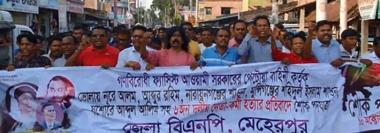 মেহেরপুর অফিস জানিয়েছে, সারাদেশে ৬ জন দলীয় কর্মী নিহত হওয়ার প্রতিবাদে কেন্দ্র ঘোষিত কর্মসূচির অংশ হিসেবে মেহেরপুরে জেলা বিএনপির শোক সমাবেশ পালিত হয়েছে। গতকাল সোমবার বিকালে শোক পদযাত্রা শেষে মেহেরপুর-কাথুলী বাসস্ট্যান্ডে জেলা বিএনপির সভাপতি মাসুদ অরুনো সভাপতিত্বে ও পৌর বিএনপির সভাপতি জাহাঙ্গীর বিশ্বাস এর সঞ্চালনায় শোক সমাবেশ করা হয়। এ সময় উপস্থিত ছিলেন জেলা বিএনপির সিনিয়র সহ-সভাপতি জাভেদ মাসুদ মিল্টন, আব্দুর রহমান, ইলিয়াস হোসেন, মুজিবনগর উপজেলা বিএনপির সভাপতি আমিরুল ইসলাম, গাংনী উপজেলা সভাপতি রেজাউল হক মাস্টার, সহ অঙ্গ সহযোগী সংগঠনের নেতৃবৃন্দ উপস্থিত ছিলেন।