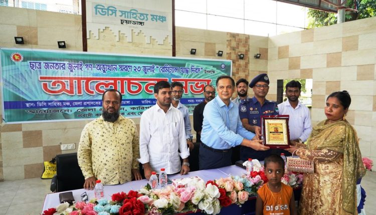 চুয়াডাঙ্গায় ছাত্র জনতার জুলাই গণ-অভ্যুথান স্মরণে রেমিট্যান্স যোদ্ধা দিবস উপলক্ষ্যে আলোচনাসভা অনুষ্ঠিত হয়েছে। গতকাল শনিবার সকাল ১০টায় জেলা প্রশাসক কার্যালয়ের সাহিত্যমঞ্চে এ আলোচনাসভা অনুষ্ঠিত হয়। চুয়াডাঙ্গা টিটিসি’র অধ্যক্ষ মো. মুছাব্বেরুজ্জামানের সভাপতিত্বে অনুষ্ঠিত আলোচনা সভায় জেলা প্রশাসক মোহাম্মদ জহিরুল ইসলাম প্রধান অতিথি হিসেবে বক্তব্য রাখেন। টিটিটিসি’ ইলেকট্রিক্যাল বিভাগের ইন্সট্যাক্টর আনোয়ার কবিরের সঞ্চালনায় জেলার পুলিশ সুপার খন্দকার গোলাম মওলা বিশেষ অতিথি হিসেবে বক্তব্য রাখেন। সভায় জেলা কর্মসংস্থান ও জনশক্তি কার্যালয়ের সহকারী পরিচালক আব্দুল হালিম স্বাগত বক্তব্য রাখেন। সভায় বৈষম্যবিরোধী ছাত্র আন্দোলনের সাবেক আহবায়ক আষলাম হোসেন অর্ক, ইসলামী ব্যাংকের সিনিয়র প্রিন্সিপাল অফিসার তানজিনুর রহমান ও রেমিটেন্স যোদ্ধা মো. হাসান বক্তব্য রাখেন। সভায রেমিট্যান্স যোদ্ধা আমেরিকা প্রবাসী আনসার আলী ও জর্ডান প্রবাসী মোছা. পারভীন আক্তারকে ক্রেস্ট প্রদান করা হয়।