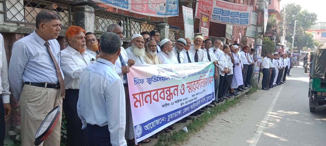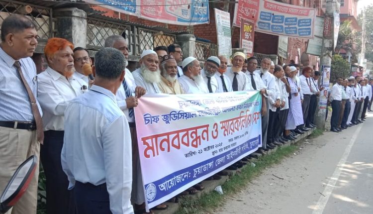 মানববন্ধনে উপস্থিত ছিলেন চুয়াডাঙ্গা জেলা আইনজীবী সমিতির সভাপতি শামীম রেজা ডালিম, অ্যাডভোকেট মোঃ আহসান আলী, চুয়াডাঙ্গা জেলা জজ আদালতের পাবলিক প্রসিকিউটর (পিপি) অ্যাডভোকেট মারুফ সরোয়ার বাবু, নারী ও শিশু নির্যাতন দমন ট্রাইব্যুনালের পিপি অ্যাডভোকেট মোঃ মুকুল হোসেন, সিনিয়র অ্যাডভোকেট আঃ সামাদ এবং সিনিয়র অ্যাডভোকেট সেলিম উদ্দিন খান সহ বারের সদস্যবৃন্দ।