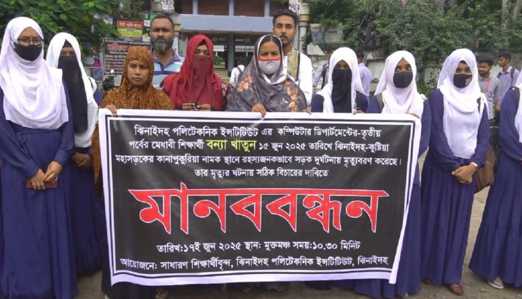 শৈলকুপায় শিক্ষার্থীকে হত্যার পর গাড়িচাপা বলে প্রচার মামলা নিচ্ছে না পুলিশ : প্রতিবাদে সহপাঠীদের মানববন্ধন
