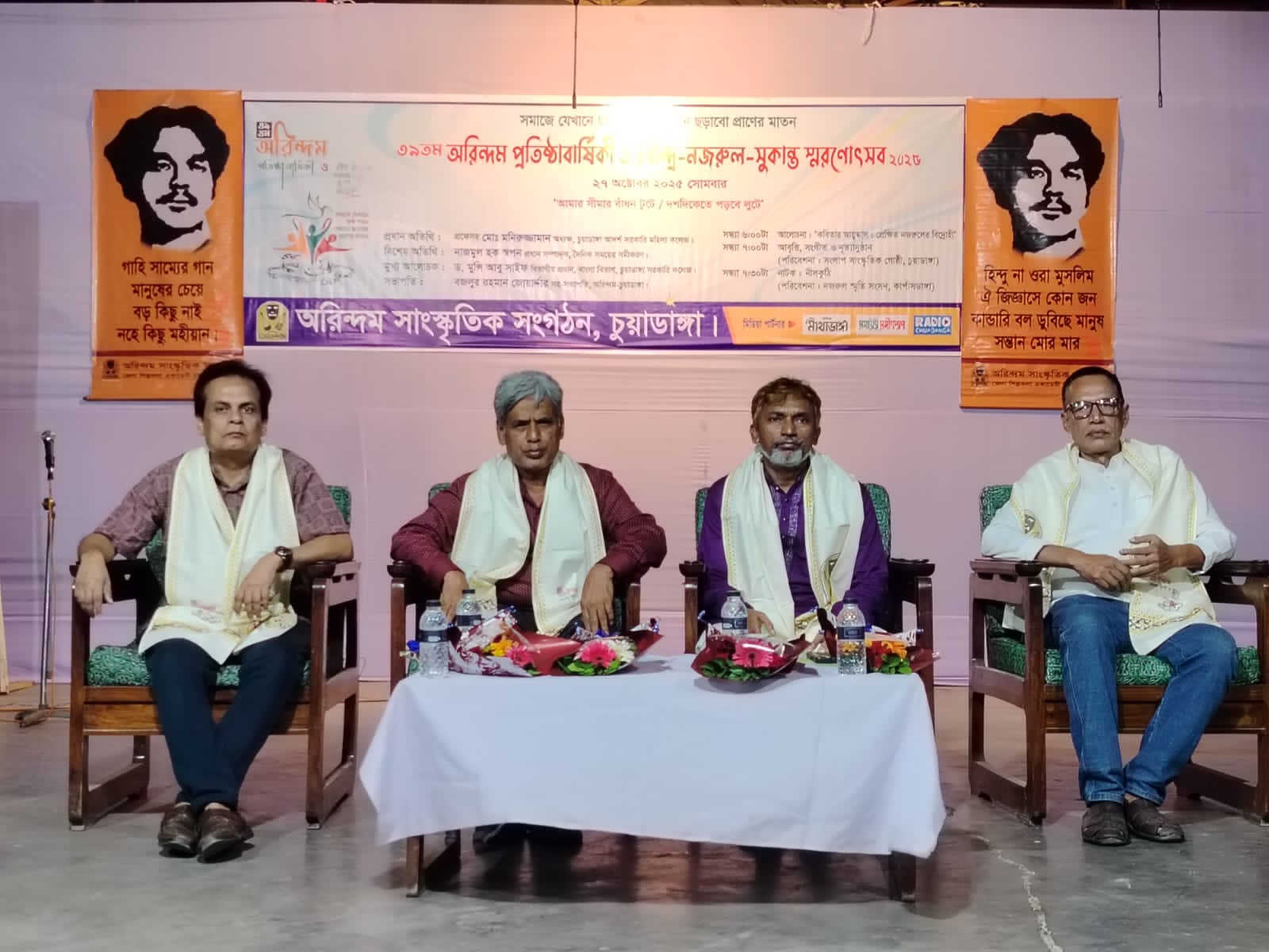 স্টাফ রিপোর্টার: “সমাজে যেখানে ছন্দ পতন সেখানে ছড়াবো প্রানের মাতন” এই স্লোগানকে সামনে রেখে চুয়াডাঙ্গার স্বনামধন্য সাংস্কৃতিক সংগঠন অরিন্দম সাংস্কৃতিক সংগঠনের ৩৯তম প্রতিষ্ঠা বার্ষিকীর তৃতীয় দিনের অনুষ্ঠান সফলভাবে সম্পন্ন হয়েছে। এদিনের আয়োজনে মূল প্রতিপাদ্য ছিল “কবি কাজী নজরুল ইসলামের কবিতার আয়ুষ্কাল: প্রেক্ষিত নজরুলের বিদ্রোহী”। অনুষ্ঠানসূচিতে ছিল আলোচনা সভা, আবৃত্তি, সংগীত, নৃত্য পরিবেশন এবং নাটক মঞ্চায়ন।