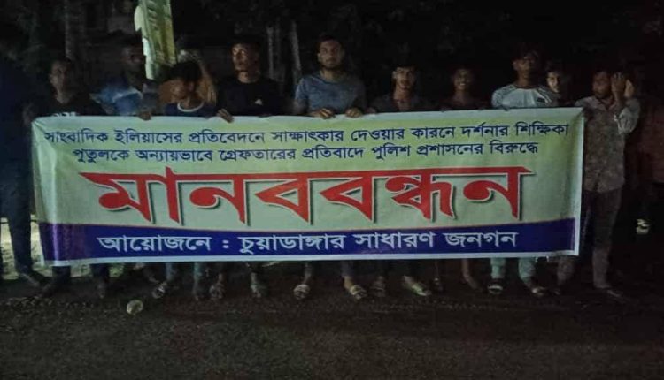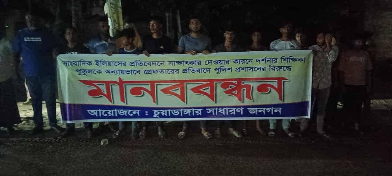 সাংবাদিক ইলিয়াসের সাক্ষাৎকারের জেরে গ্রেপ্তার শিল্পী পুতুলের মুক্তি ও বাড়ি ভাঙচুরের প্রতিবাদে আলমডাঙ্গা ও চুয়াডাঙ্গায় মানববন্ধন