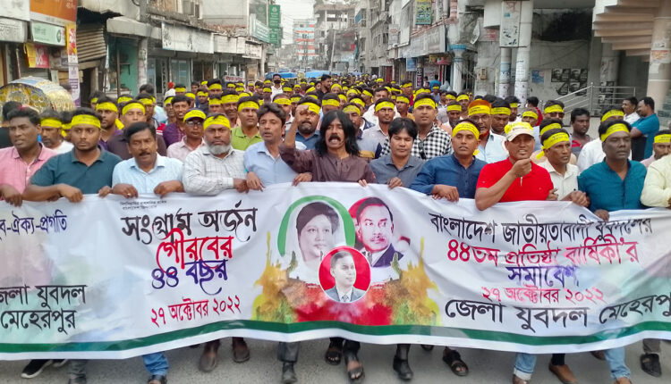 মেহেরপুর অফিস জানিয়েছে, মেহেরপুরে জেলা যুবদলের ৪৪তম প্রতিষ্ঠাবার্ষিকী পালন উপলক্ষে শহরে বিক্ষোভ মিছিল ও সমাবেশ অনুষ্ঠিত হয়েছে। গতকাল বৃহস্পতিবার বিকেলে হোটেল বাজার মোড় থেকে বিক্ষোভ মিছিলটি বের হয়ে মেহেরপুর শহরের প্রধান সড়ক প্রদক্ষিণ করে জেলা বিএনপির কার্যালয়ের সামনে পৌঁছে সমাবেশ অনুষ্ঠিত হয়। জেলা যুবদলের সভাপতি জাহিদুল হক জাহিদের সভাপতিত্বে সমাবেশে প্রধান অতিথি ছিলেন মেহেরপুর জেলা বিএনপির সভাপতি সাবেক সংসদ সদস্য মাসুদ অরুন। বিশেষ অতিথি ছিলেন মেহেরপুর সদর উপজেলা বিএনপির সভাপতি অ্যাড. মারুফ আহাম্মেদ বিজন, মুজিবনগর উপজেলা বিএনপির সভাপতি আমিরুল ইসলাম, পৌর বিএনপির সভাপতি মেহেরপুর সরকারি কলেজের সাবেক ভিপি জাহাঙ্গীর বিশ্বাস ও মেহেরপুর জেলা বিএনপির যুব বিষয়ক সম্পাদক হাজি ফজলু খাঁন। অনুষ্ঠান পরিচালনা করেন জেলা যুবদলের সাধারণ সম্পাদক কাওসার আলী। অনুষ্ঠানে অন্যান্যের মধ্যে বক্তব্য রাখেন জেলা যুবদলের যুগ্মসম্পাদক মেহেদী হাসান রোকন, সদর উপজেলা যুবদলের আহ্বায়ক লিয়াকত আলী, মুজিবনগর উপজেলা যুবদলের আহ্বায়ক আবুল হাসান, সদস্য সচিব আনোয়ারুল ইসলাম, পৌর যুবদলের আহ্বায়ক সামিউল ইসলাম লিজন, সদস্য সচিব নওশেল আহমেদ রনি, গাংনী উপজেলা যুবদলের আহ্বায়ক মালেক হোসেন চপল, সদস্য সচিব জাহিদুল ইসলাম, গাংনী পৌর যুবদলের আহ্বায়ক সাহিদুল ইসলাম, সদস্য সচিব এনামুল হক প্রমুখ। এছাড়াও বিক্ষোভ মিছিল ও সমাবেশে উপস্থিত ছিলেন বিভিন্ন ইউনিটের নেতা-কর্মীরা।