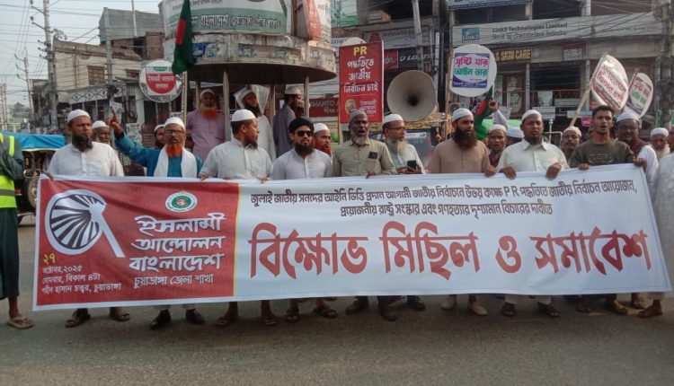 স্টাফ রিপোর্টার:জুলাই জাতীয় সনদের আইনি স্বীকৃতি প্রদান, আনুপাতিক প্রতিনিধিত্ব (পিআর) পদ্ধতিতে জাতীয় নির্বাচন, প্রয়োজনীয় রাষ্ট্র সংস্কার ও গণহত্যার দৃশ্যমান বিচারের দাবিসহ ৫ দফা দাবি বাস্তবায়নের দাবিতে বিক্ষোভ মিছিল ও সমাবেশ করেছে ইসলামী আন্দোলন বাংলাদেশ, চুয়াডাঙ্গা জেলা শাখা।