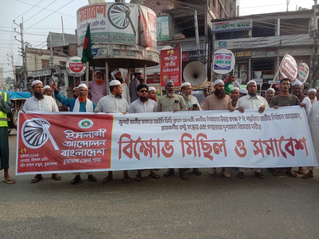 স্টাফ রিপোর্টার:জুলাই জাতীয় সনদের আইনি স্বীকৃতি প্রদান, আনুপাতিক প্রতিনিধিত্ব (পিআর) পদ্ধতিতে জাতীয় নির্বাচন, প্রয়োজনীয় রাষ্ট্র সংস্কার ও গণহত্যার দৃশ্যমান বিচারের দাবিসহ ৫ দফা দাবি বাস্তবায়নের দাবিতে বিক্ষোভ মিছিল ও সমাবেশ করেছে ইসলামী আন্দোলন বাংলাদেশ, চুয়াডাঙ্গা জেলা শাখা।