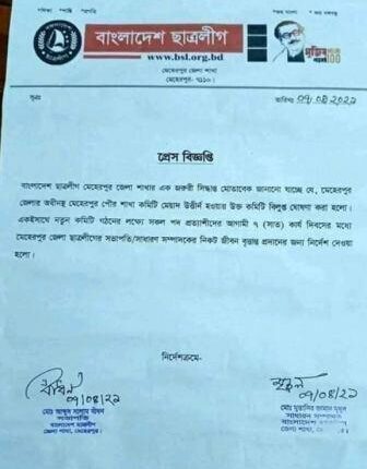 প্রেস বিজ্ঞপ্তিতে বলা হয়েছে, বাংলাদেশ ছাত্রলীগ মেহেরপুর জেলা শাখার এক জরুরি সিদ্ধান্ত মোতাবেক মেহেরপুর পৌর শাখা কমিটির মেয়াদ উত্তীর্ণ হওয়ায় ওই কমিটি বিলুপ্ত করা হলো। একই সাথে নতুন কমিটি গঠনের লক্ষ্যে সকল পদ প্রত্যাশীদের আগামী সাত কার্যদিবসের মধ্যে জেলা ছাত্রলীগের সভাপতি-সাধারণ সম্পাদকের নিকট জীবন বৃত্তান্ত প্রদানের জন্য নির্দেশ দেয়া হলো।