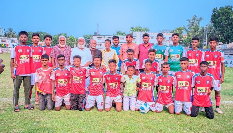 স্টাফ রিপোর্টার: বাংলাদেশ ফুটবল ফেডারেশন আয়োজিত অনূর্ধ্ব- ১৫ জাতীয় ফুটবল টুর্নামেন্টে ১৩-০ গোলের বিশাল ব্যবধানে চুয়াডাঙ্গা জেলাদল জয়লাভ করেছে। গতকাল শুক্রবার ঝিনাইদহ স্টেডিয়ামে অনুষ্ঠিত খেলায় চুয়াডাঙ্গা জেলা দলের মুখোমুখি হয় মেহেরপুর জেলা দল।তারুণ্যে ভরপুর চুয়াডাঙ্গা জেলা দলের ফুটবল খেলোয়াড়রা রীতিমতো মেহেরপুরের বিপক্ষে গোল উৎসবে মেতেছিল। প্রথম অর্ধে চুয়াডাঙ্গা জেলা দল ৫-০ গোলে এগিয়েছিলো। দ্বিতীয় অর্ধের শুরুতে আবারো মূহুর মূহুর আক্রমণে মেহেরপুর জেলা দলের রক্ষণভাগকে গুঁড়িয়ে দিয়ে দ্বিতীয়ার্ধের নির্ধারিত সময়ে আরো ৮টি গোল নিজেদের ঝুলিতে জমা করে চুয়াডাঙ্গা জেলা দল। ফলে নির্ধারিত সময়ে চুয়াডাঙ্গা জেলা দল ১৩-০ গোলের বিশাল ব্যবধানে মেহেরপুর জেলা দলকে পরাজিত করে। চুয়াডাঙ্গা জেলা দলের পক্ষে গোল করেন রিমন ৪টি, বন্ধন ৩টি,পারভেজ ২ টি, হাবিবুল্লাহ ২টি, রাহুল একটি ও জুলফিকার একটি গোল করে। মেহেরপুর জেলা দলকে গোল বন্যায় ভাসিয়ে জয় লাভ করায় চুয়াডাঙ্গা জেলা দলের কর্মকর্তা সাবেক ফুটবলার বিপুল হাসান হ্যাজি সকল খেলোয়াড় ও কর্মকর্তাদের ধন্যবাদ জানিয়েছেন। হ্যাটট্রিক সহ সারা মাঠে নৈপুণ্য দেখিয়ে ম্যান অব দা ম্যাচের পুরস্কার অর্জন করে চুয়াডাঙ্গা জেলা দলের বন্ধন। চুয়াডাঙ্গা জেলা দলের কোচ হিসেবে দায়িত্ব পালন করেন ঢাকার ব্রাদার্স ইউনিয়ান ক্লাবের সাবেক দলনায়ক চুয়াডাঙ্গা ফুটবল একাডেমির কোচ পরিচালক তরিকুল ইসলাম তরুণ। চুয়াডাঙ্গা জেলা দলের কর্মকর্তা হিসেবে মাঠে উপস্থিত ছিলেন সাবেক কৃতি ফুটবলার সরোয়ার হোসেন জোয়ার্দ্দার মধু, নাজমুল হক শান্তি, রেজাউল হক জোয়ার্দ্দার রেজা, শরিফুল ইসলাম ও শফিকুল ইসলাম মালেক। উল্লেখ্য আগামী ১৮ মে চুয়াডাঙ্গা জেলা দল টুর্নামেন্টে নিজেদের শেষ ম্যাচে মুখোমুখি হবে কুষ্টিয়া জেলা দলের সঙ্গে।
