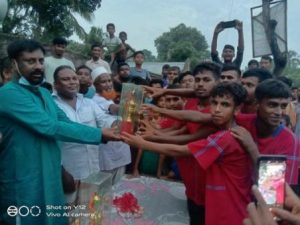 দামুড়হুদা অফিসঃ দামুড়হুদার বদনপুরে প্রীতি ফুটবল ম্যাচের ফাইনাল খেলার পুরস্কার বিতরণী অনুষ্ঠিত হয়েছে। শুক্রবার বিকেল ৪টার দিকে দামুড়হুদার নাপিতখালি সরকারি প্রাইমারী স্কুল মাঠে খেলাটি অনুষ্ঠিত হয়। বদনপুর গ্রামের যুবসমাজের আয়োজনে ও আব্দুল কুদ্দুসের উদ্যোগে খেলায় অংশগ্রহণ করে কাইজার একাদশ বনাম মর্ডান একাদশ। খেলার নির্ধারিত সময়ে অমিমাংশিত ভাবে খেলাটি শেষ হয়। খেলার নিয়মঅনুযায়ী খেলাটি ট্রাইবেকারে গড়ায়। ট্রাইবেকারে কাইজার একাদশ ৩-১গোলে মর্ডান একাদশ কে পরাজিত করে। খেলা শেষে পুরস্কার বিতরণী অনুষ্ঠান অনুষ্ঠিত হয়। সাবেক মেম্বার শফিউল আলম সন্টুর সভাপতিত্বে পুরস্কার বিতরণী অনুষ্ঠানে প্রধান অতিথি হিসেবে উপস্থিত থেকে পুরস্কার তুলে দেন দামুড়হুদা উপজেলা যুবলীগের সাধারণ সম্পাদক ও দামুড়হুদা সদর ইউনিয়ন পরিষদ নির্বাচনে চেয়ারম্যান পদপ্রার্থী হযরত আলী। এসময় বিশেষ অতিথি হিসেবে উপস্থিত ছিলেন মোশারেফ হোসেন, মতিয়ার রহমান, শফিকুল ইসলাম, ৮নং মোক্তারপুর ওয়ার্ড আওয়ামী লীগের সাধারণ সম্পাদক সাইদুর রহমান টোকন। এসময় অতিথি ছিলেন দামুড়হুদা উপজেলা যুবলীগ নেতা ইলিয়াস হোসেন, জুয়েল রানা, উত্তম, আতিকুল ইসলাম রনি। খেলায় রেফারির দায়িত্বে ছিলেন হাবিবুর রহমান, সহকারী রেফারি ছিলেন হৃদয় হোসেন, রশিক, ধারাভাষ্যকার ছিলেন মিলন হোসেন।