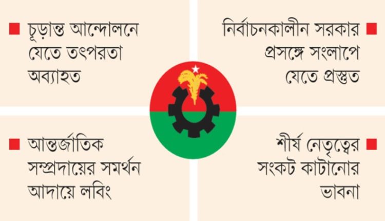 সূত্র জানায়, দলীয় নেতাকর্মীর বিরুদ্ধে মামলা-হামলা ও গ্রেপ্তার মোকাবিলায় পাল্টা কৌশল নেবে বিএনপি। তবে চলমান শান্তিপূর্ণ কর্মসূচি যাতে সহিংস রূপ ধারণ না করে সেদিকে সজাগ থাকবে। আন্দোলনের পাশাপাশি আগামী নির্বাচনের প্রস্তুতিও নিচ্ছে দলটি। আন্দোলনের কর্মসূচির মাধ্যমে তৎপর হয়ে উঠছেন সম্ভাব্য দলীয় মনোনয়নপ্রত্যাশীরা। নীতিনির্ধারণী পর্যায়ে জোর তদবির-লবিংও শুরু হয়েছে। পাশাপাশি অবাধ ও সুষ্ঠু নির্বাচনে আন্তর্জাতিক সম্প্রদায়ের সমর্থন আদায়েও পর্দার আড়ালে জোর লবিং চালিয়ে যাচ্ছে দলটি।