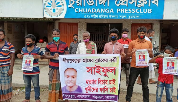 সংবাদ সম্মেলন ও মানববন্ধনে নিহত সাইফুল ইসলামের বাবাসহ নিকটআত্মীয়রা তাদের বক্তব্যে বলেন, গত ২৪ মে সন্ধ্যা থেকে দামুড়হুদার পীরপুরকুল্লা গ্রামের সাইফুল ইসলাম (৩৮) নিখোঁজ হয়। পরদিন ২৫ মে সকালে দামুড়হুদা উপজেলার সীমান্তবর্তী কুতুবপুর বিজিবি ক্যাম্পের পাশ থেকে তার মরদেহ উদ্ধার করে পুলিশ। ওইদিন রাতেই পাঁচজনকে আসামি করে দামুড়হুদা মডেল থানায় একটি হত্যা মামলা দায়ের করেন সাইফুলের পিতা আব্দার আলী। তবে, হত্যাকা-ের ১৭ দিন পার হলেও এখন পর্যন্ত মামলার এজাহারভূক্ত কোনো আসামিকেই ধরতে পারেনি পুলিশ। এজাহারভূক্ত পাঁচজনই এখনও ধরা-ছোঁয়ার বাইরে।