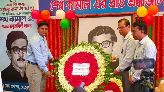 মেহেরপুর অফিস জানিয়েছে, মেহেরপুর জেলা প্রশাসনের উদ্যোগে গতকাল শনিবার সকালে মেহেরপুর জেলা প্রশাসকের কার্যালয় চত্বরে বীর মুক্তিযোদ্ধা শহীদ ক্যাপ্টেন শেখ কামালের প্রতিকৃতিতে পুষ্পমাল্য অর্পণ করার মধ্যে দিয়ে বীর মুক্তিযোদ্ধা শহীদ ক্যাপ্টেন শেখ কামালের ৭৪তম জন্মবার্ষিকী উপলক্ষে শ্রদ্ধা নিবেদন করা হয়। মেহেরপুর জেলা প্রশাসক মো. শামীম হাসান সর্বপ্রথম জনপ্রশাসন প্রতিমন্ত্রী ফরহাদ হোসেন ও মেহেরপুর জেলা বাসীর পক্ষে পুষ্পমাল্য অর্পণ করেন। এর পরপরই পুলিশ বিভাগের পক্ষে অতিরিক্ত সুপার কামরুল আহসান, মুক্তিযোদ্ধা সংসদ, মেহেরপুর পাবলিক লাইব্রেরী ও জেলা শিল্পকলা একাডেমীর পক্ষে জেলা প্রশাসক মো. শামীম হাসান, মেহেরপুর জেলা পরিষদ ও জাতীয় মহিলা সংস্থার পক্ষে জেলা পরিষদের সদস্য শামীম আরা হীরা, মেহেরপুর জেলা আওয়ামী লীগের পক্ষে জেলা আওয়ামী লীগের সহ-সভাপতি আব্দুস সামাদ বাবলু বিশ্বাস, সরকারি কলেজের পক্ষে শিক্ষক পরিষদের সাধারণ সম্পাদক আব্দুল্লাহ আল আমিন, মেহেরপুর পৌরসভার পক্ষে কাউন্সিলর আল মামুন, মেহেরপুর জেলা আনসার ও ভিডিপির পক্ষে সার্কেল অ্যাডজুটেন্ট আল মামুন, মেহেরপুর সদর উপজেলা পরিষদের পক্ষে সদর উপজেলা চেয়ারম্যান অ্যাডভোকেট ইয়ারুল ইসলাম, টিটিসির পক্ষে অধ্যক্ষ আরিফ আহমেদ, জেলা মাদকদ্রব্য নিয়ন্ত্রণ অধিদপ্তরের পক্ষে পরিদর্শক আবুল হাসেম, জেলা কারাগারের পক্ষে জেলসুপার মনির আহমেদ, ফায়ার সার্ভিস ও সিভিল ডিফেন্সের পক্ষে লিডার ইদ্রিস আলী, জেলা যুব উন্নয়ন অধিদপ্তরের পক্ষে জেলা যুব উন্নয়ন অধিদপ্তরের উপ-পরিচালক ফিরোজ আহমেদ, জেলা সমাজসেবা অধিদপ্তরের পক্ষে উপ-পরিচালক কাজী কাদের মোহাম্মদ ফজলে রাব্বী, মেহেরপুর সড়ক ও জনপদ বিভাগের পক্ষে উপ-বিভাগীয় প্রকৌশলী মিজানুর রহমান, সমবায় অফিসের পক্ষে জেলা সমবায় কার্যালয়ের সহকারী প্রশিক্ষক রোকনুজ্জামান তুষার, জেলা প্রাণিসম্পদ অধিদপ্তরের পক্ষে জেলা প্রাণিসম্পদ কর্মকর্তার সাইদুর রহমান প্রমুখ।