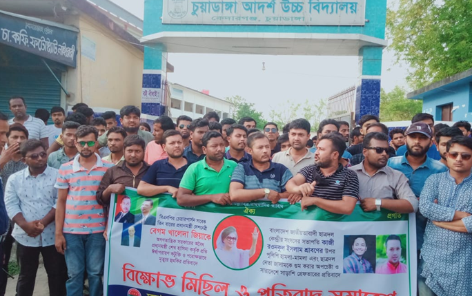 অপরদিকে, সোমবার বিকেলে চুয়াডাঙ্গা জেলা ছাত্রদলের সাধারণ সম্পাদক মোমিন মালিতার নেতৃত্বে জেলা-উপজেলা-ইউনিয়ন পর্যায়ের নেতাকর্মীরা চুয়াডাঙ্গা সাহিত্য পরিষদ চত্বরে জড়ো হতে থাকে। পরে সেখান থেকে একটি বিক্ষোভ মিছিল বের হয়ে শহরের সড়ক প্রদক্ষিণ করে সদর থানার সামনে পৌঁছুলে পুলিশের বাঁধার মুখে পড়ে। ছত্রভঙ্গ হয়ে সেখান থেকে সাহিত্য পরিষদ চত্বরে ফিরে প্রতিবাদ সমাবেশ অনুষ্ঠিত হয়।