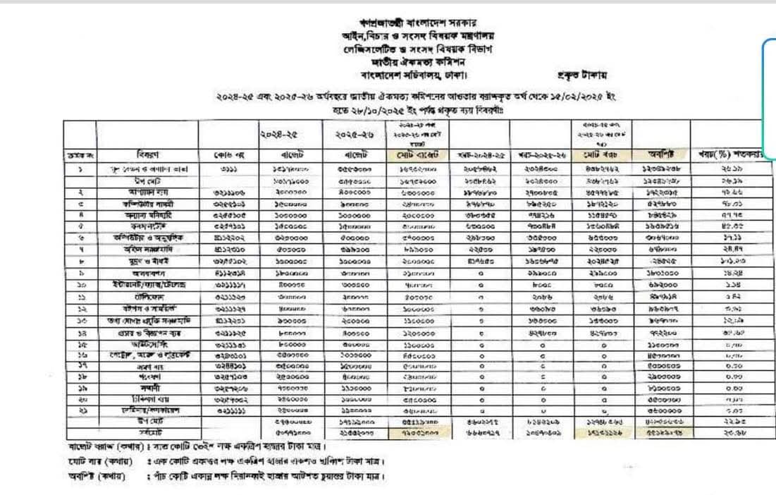 অপপ্রচারকারীদের নির্জলা মিথ্যাচারের ফলে জনমনে কোনো ধরনের বিভ্রান্তি সৃষ্টি না হয়—সেই লক্ষ্যে কমিশনের পক্ষ থেকে স্পষ্টভাবে জানানো যাচ্ছে যে, গত ১৫ ফেব্রুয়ারি ২০২৫ তারিখে কার্যক্রম শুরু করার পর ২০২৪–২৫ এবং ২০২৫–২৬ অর্থবছরে জাতীয় ঐকমত্য কমিশনের সর্বমোট বাজেট ছিল ৭ কোটি ২৩ লাখ ৩১ হাজার ২৬ টাকা।