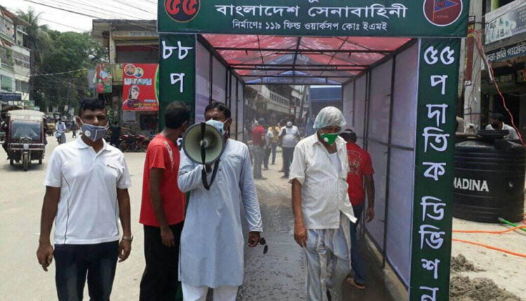 করোনাভাইরাস প্রতিরোধে ঝিনাইদহের কালীগঞ্জে জীবানুনাশক টানেল স্থাপন করা হয়েছে। বুধবার সকালে কালীগঞ্জ শহরের মধূগঞ্জবাজারে সেনাবাহিনীর তত্ত্বাবধানে নির্মিত ট্যানেলটি জনসাধারণের জন্য খুলে দেয়া হয়েছে। শহরে প্রবেশ পথে পোশাকের দোকানে আগত ক্রেতারা এ টানেলের মধ্যে দিয়ে জীবাণুমুক্ত হয়ে দোকানে কেনাকাটা করবেন।