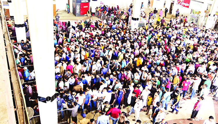 স্টাফ রিপোর্টার: রাজধানীর কমলাপুর রেলস্টেশনে ঈদে আগাম টিকিট বিক্রির দ্বিতীয় দিন শনিবার দুই থেকে তিন ঘণ্টার মধ্যে সব টিকিট বিক্রি শেষ হয়ে গেছে। সকাল ৮টায় কমলাপুর রেলস্টেশনে ৬ জুলাইয়ের ট্রেনের টিকিট বিক্রি শুরু হয়। কোনো কোনো কাউন্টারে ১০টার মধ্যে সব টিকিট শেষ হয়ে যায়। নারীদের একটি কাউন্টার ছাড়া পুরুষদের সব কাউন্টারে ১১টার মধ্যে সব টিকিট শেষ হয়ে যায়। টিকিট শেষ হয়ে যাওয়ার পরও টিকিটপ্রত্যাশীদের লাইনে দাঁড়িয়ে অপেক্ষা করতে দেখা গেছে। রোববার সকাল ৮টায় ৭ জুলাইয়ের ট্রেনের টিকিট বিক্রি শুরু হওয়া মাত্রই টিকিট কেনার আশায় স্টেশনে থাকবেন তারা। সরেজমিন স্টেশনে গিয়ে দেখা যায়, টিকিট শেষ হয়ে যাওয়ার পরও লাইনে দাঁড়িয়ে আছেন কয়েকশ’ মানুষ। তারা নিজেদের মধ্যে সিরিয়াল করছেন। সেই সিরিয়াল করা নিয়ে নিজেদের মধ্যে গন্ডগোলও হয়েছে। কেউ কেউ অভিযোগ তুলেছেন, পেছনে থাকা অনেক ব্যক্তির সিরিয়াল আগে হয়ে গেছে। শুক্রবার বিকালে টিকিটের জন্য কমলাপুর রেলস্টেশনে আসেন ঢাকার একটি বেসরকারি বিশ্ববিদ্যালয়ে অধ্যয়নরত শিক্ষার্থী শাফিউলস্নাহ। যখন আসেন, তখন তার সিরিয়াল ছিল ৮৮ নম্বর। শনিবার তার সামনে ১০ জনের মতো থাকতেই টিকিট শেষ হয়ে যায়। তিনি রোববার টিকিট কাটার জন্য লাইনে থেকে গেছেন। সে সময় তার সিরিয়াল নম্বর ২। শাফিউল্লাহ বলেন, ‘এবার কোরবানির পশুবাহী গাড়ি চলাচল করবে। রাস্তায় অনেক যানজট থাকবে। তাই কষ্ট হলেও ট্রেনের টিকিট কাটবো। সে জন্য আজকে সারা দিন ও রাত স্টেশনে থাকব। একবার ট্রেনের টিকিট পেলে যাওয়া সহজ হয়ে যাবে।’