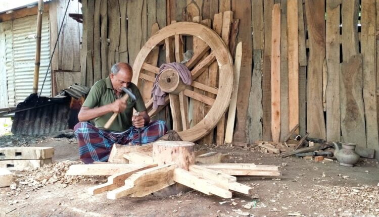 দামুড়হুদার কার্পাসডাঙ্গায় বিলপ্ত প্রায় গরুর গাড়ির চাকা এখনো তৈরী করে চলেছেন শফিকুল