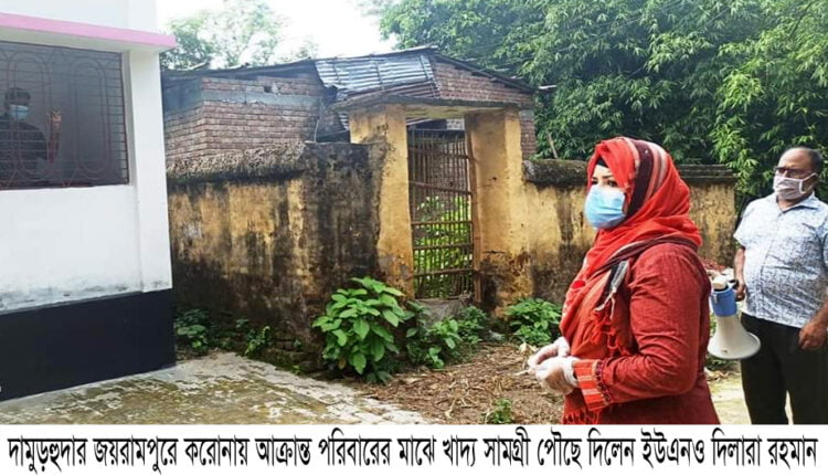 দামুড়হুদা ব্যুরো: দামুড়হুদার জয়রামপুরে করোনায় আক্রান্ত পরিবারে উপজেলা প্রশাসনের পক্ষ থেকে খাদ্য সামগ্রী পৌছে দেয়া হয়েছে। গতকাল শুক্রবার বিকেলে দামুড়হুদা উপজেলা নির্বাহী অফিসার ইউএনও দিলারা রহমান করোনা আক্রান্ত পরিবারের মাঝে খাদ্য সামগ্রী পৌছে দেন। এ সময় তিনি হ্যান্ডমাইকে বলেন, আমি ইউএনও দিলারা রহমান। জেলা প্রশাসক স্যারের নির্দেশনা মোতাবেক আমি এখানে এসেছি। করোনায় আক্রান্ত পরিবারের সাথে আপনারা কেউ অমানবিক আচরন করবেন না। আপনারা তাদের সাথে মানবিক আচরণ করুন। অন্যথায় তাদের বিরুদ্ধে আইনগত ব্যবস্থা নেয়া হবে।