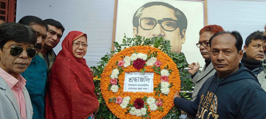 মেহেরপুর অফিস জানিয়েছে, বঙ্গবন্ধুর স্বদেশ প্রত্যাবর্তন দিবস উপলক্ষ্যে মেহেরপুর জেলা আওয়ামী লীগ ও অঙ্গ সংগঠনের উদ্যোগে জাতির পিতা বঙ্গবন্ধু শেখ মুজিবুর রহমানের প্রতিকৃতিতে পুষ্পমাল্য অর্পণ করা হয়েছে। গতকাল মঙ্গলবার সকালে মেহেরপুর জেলা আওয়ামী লীগের সভাপতি জনপ্রশাসন প্রতিমন্ত্রী ফরহাদ হোসেন এমপি’র বাসভবন প্রাঙ্গণে জাতির জনক বঙ্গবন্ধু শেখ মুজিবুর রহমানের প্রতিকৃতিতে পুষ্পমাল্য অর্পণ করা হয়। মেহেরপুর জেলা আওয়ামী লীগের সহ-সভাপতি সদর উপজেলার পিরোজপুর ইউনিয়নের চেয়ারম্যান আব্দুস সামাদ বাবলু বিশ্বাস, জেলা আওয়ামী লীগের সদস্য শামীম আরা হীরা উপস্থিত থেকে জেলা আওয়ামী লীগের পক্ষে পুষ্পমাল্য অর্পণ করেন। পরে সেখানে মেহেরপুর জেলা ছাত্রলীগের সভাপতি আব্দুস সালাম বাঁধনের নেতৃত্বে জেলা ছাত্রলীগ, সদর উপজেলা যুব মহিলা লীগের সভানেত্রী লতিফন নেছা লতার নেত্রীতে যুব মহিলা লীগের পক্ষ থেকে পৃথক পৃথকভাবে পুষ্পমাল্য অর্পণ করা হয়। এ সময় অন্যান্যের মধ্যে মেহেরপুর সদর উপজেলা পরিষদের ভাইস চেয়ারম্যান আবুল হাসেম, মেহেরপুর জেলা যুবলীগের সাবেক সভাপতি সাজ্জাদুল আনাম, সরকারি কলেজ ছাত্রলীগের সাধারণ সম্পাদক কুতুব উদ্দিন প্রমুখ উপস্থিত ছিলেন।