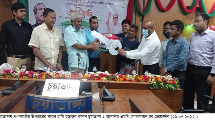 গতকাল বৃহস্পতিবার সকালে গণভবন থেকে ভিডিও কনফারেন্সের মাধ্যমে পাঁচটি আশ্রয়ণ প্রকল্পে যুক্ত হয়ে ভূমিহীনদের মাঝে ঘর ও জমির কাগজ হস্তান্তর অনুষ্ঠানের উদ্বোধন করেন প্রধানমন্ত্রী। এ সময় গণভবন প্রান্তে অনুষ্ঠান পরিচালনা করেন প্রধানমন্ত্রী মুখ্যসচিব ড. আহমদ কায়কাউস, আশ্রয়ণ প্রকল্পের ডিজিটাল উপস্থাপনা করেন আশ্রয়ণ প্রকল্প-২’র প্রকল্প পরিচালক আবু সালেহ মোহাম্মদ ফেরদৌস খান প্রমুখ। প্রকল্প এলাকাতে অনুষ্ঠান পরিচালনা করেন সংশ্লিষ্ট জেলা প্রশাসকেরা। চুয়াডাঙ্গা জেলা প্রশাসকের সম্মেলন কক্ষে আয়োজিত উদ্বোধন অনুষ্ঠানে প্রধান অতিথি হিসেবে উপস্থিত ছিলেন চুয়াডাঙ্গা-১ আসনের সংসদ সদস্য বীর মুক্তিযোদ্ধা সোলায়মান হক জোয়ার্দ্দার ছেলুন। জেলা প্রশাসক মোহাম্মদ আমিনুল ইসলাম খানের সভাপতিত্বে অনুষ্ঠিতসভায় প্রধান অতিথি সদর উপজেলার ভূমিহীনদের মাঝে ঘর ও জমির দলিল তুলে দেন। উপস্থিত ছিলেন চুয়াডাঙ্গা পুলিশ সুপারের প্রতিনিধি অতিরিক্ত পুলিশ সুপার (প্রশাসন) আবু তারেক, স্থানীয় সরকার প্রকৌশল অধিদফরের চুয়াডাঙ্গা নির্বাহী প্রকৌশলী, চুয়াডাঙ্গা পৌর মেয়র জাহাঙ্গীর আলম মালিক খোকন প্রমুখ। স্বাগত বক্তব্যে চুয়াডাঙ্গা সদর উপজেলা নির্বাহী অফিসার শামীম ভূইয়া সদর উপজেলার ভূমিহীনদের ঘর নির্মাণ এবং তার পাশে শিশু পার্কসহ পুকুর খননসহ যেসব প্রকল্প হাতে নেয়া হয়েছে তার বিস্তারিত তুলে ধরে বলেন, সদর উপজেলার আজ ৪২টিসহ ১৬৬ পরিবারের ঘর দেয়া হলো। এ আয়োজনে প্রধান অতিথির বক্তব্যে সোলায়মান হক জোয়ার্দ্দার ছেলুন এমপি সমাজের বিত্তবানদের সহযোগিতার হাত বাড়ানোর আহ্বান জানিয়ে বলেন, বঙ্গবন্ধু আমাদের দেশ দিয়েছেন, তার সুযোগ্য কন্যা বিশ্ব দরবারে আমাদের তথা বাঙালি জাতিকে শক্ত অবস্থানে নেয়ার পাশাপাশি দেশের ভূমিহীনদের মাঝে ঘর ও জমি উপহার দিয়ে অনন্য দৃষ্টান্ত স্থাপন করেছেন।