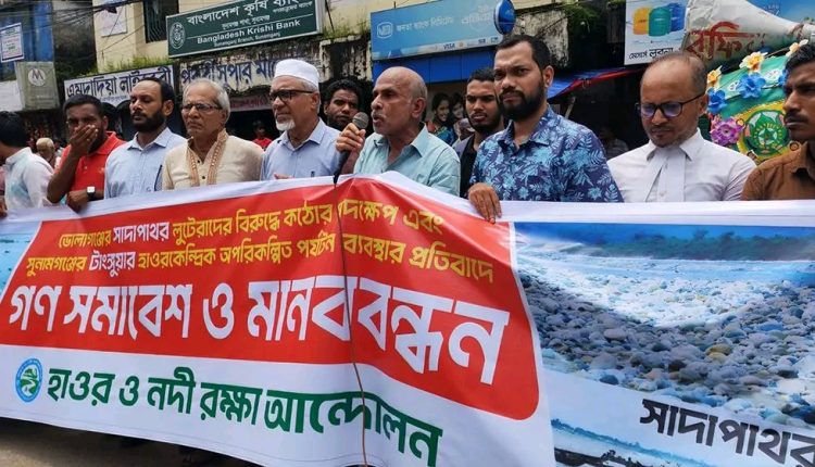 ভোলাগঞ্জের সাদাপাথর লুটেরাদের বিরুদ্ধে কঠোর পদক্ষেপ এবং সুনামগঞ্জের টাঙ্গুয়ার হাওড়কেন্দ্রিক অপরিকল্পিত পর্যটন ব্যবস্থার প্রতিবাদে সমাবেশ ও মানববন্ধন অনুষ্ঠিত হয়েছে।