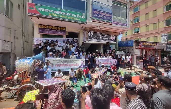 কুষ্টিয়া প্রতিনিধি: কুষ্টিয়া পৌর বিএনপির নেতা নির্বাচনে কারচুপির অভিযোগে ভোট বাতিলের দাবিতে দলটির জেলা কার্যালয় ঘেরাও কর্মসূচি পালন করেছেন একাংশের নেতা-কর্মীরা। গতকাল মঙ্গলবার সকাল থেকে দুপুর পর্যন্ত শহরের কোর্টপাড়া এলাকায় জেলা বিএনপির কার্যালয়ের সামনে এ কর্মসূচি পালিত হয়। এ কর্মসূচির সময় কয়েকজন নেতা-কর্মী কাফনের কাপড় গায়ে জড়িয়ে কার্যালয়টির সামনে শুয়ে পড়েন। দুই ঘণ্টার বেশি সময় ধরে করা বিক্ষোভ কর্মসূচিতে তারা বিভিন্ন সেøাগান দেন। একই সঙ্গে জেলা বিএনপির বর্তমান আহ্বায়ক কমিটি ভেঙে দেয়ারও দাবি জানান। এর আগে গত সোমবার দুপুরে সংবাদ সম্মেলন করে এ কর্মসূচি পালনের ঘোষণা দেন ওই অংশটির নেতা ও কুষ্টিয়া জেলা বিএনপির সাবেক যুগ্ম সাধারণ সম্পাদক কাজল মাজমাদার। গতকালকের কর্মসূচির বিষয়ে তিনি বলেন, ‘জেলা বিএনপির নেতাদের ২৪ ঘণ্টা সময় দেয়া হয়েছে। এর মধ্যে সমস্যার সমাধান না হলে আমরা হরতাল-অবরোধের মতো কঠোর কর্মসূচি দিতে বাধ্য হব।’