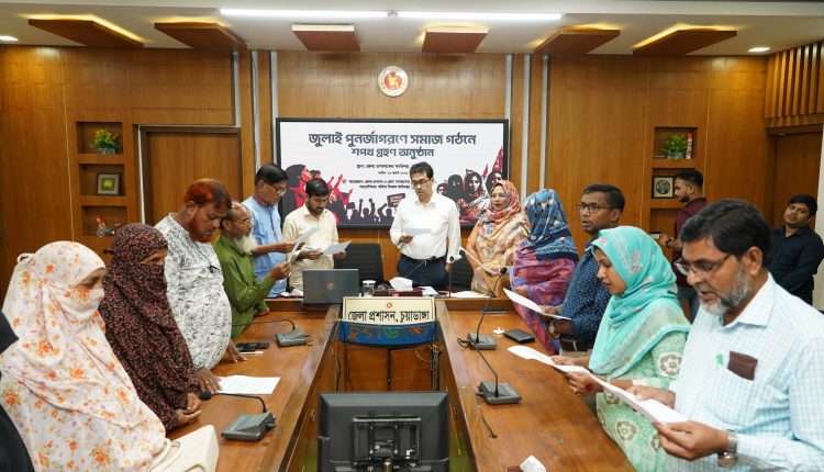 চুয়াডাঙ্গায় গতকাল শনিবার সকাল ১০টায় জেলা প্রশাসক কার্যালয়ের সম্মেলন কক্ষে এ শপথ গ্রহণ অনুষ্ঠিত হয়। সভাপতিত্ব করেন অতিরিক্ত জেলা প্রশাসক (রাজস্ব) আহমেদ মাহবুব-উল-ইসলাম। তিনি বলেন, জুলাই-আগস্ট আন্দোলন ৩৬ দিনের হলেও তাদের চেতনা গ্রামপর্যায়ে পৌঁছাতে পারবো। প্রত্যেকটি মানুষের অংশগ্রহণ করতে হবে। যে যার অবস্থান থেকে অংশ গ্রহণ করতে হবে। আমরা স্বাধীনতা অর্জন করেছি, তা রক্ষা করতে হবে। জুলাইয়ের স্পিরিট ধারণ করে চলতে হবে। যার যার অবস্থান থেকে বৈষম্যহীন সমাজ গঠন করতে পারবো। শপথ বাক্য যেন বাক্যের মধ্যে নয়, কর্মের মধ্যে প্রতিফলন ঘটাতে পারি। মাইলস্টোন স্কুল এন্ড কলেজে নিহতের শহিদী মর্যাদা এবং বেহেস্ত নসিব করুন। প্রত্যেকের সু-স্বাস্থ্য কামনা করছি। অনুষ্ঠানে অধ্যাপক সিদ্দিকুর রহমান, সমাজসেবা অধিদপ্তরের উপ-পরিচালক সিদ্দিকা সোহেলী রশীদ, মহিলা ও শিশু বিষয়ক কর্মকর্তা মাকসুরা জান্নাত, পৌর বিএনপির সভাপতি সিরাজুল ইসলাম মনি, জুলাই শহীদ শাহরিয়ার শুভর পিতা মো. আবু সাঈদ, বৈষম্যবিরোধী ছাত্র আন্দোলনের সাবেক আহ্বায়ক আসলাম হোসেন অর্ক, জুলাইযোদ্ধা মাহফুজ হোসেন, তামান্না খাতুন, হাসনা জাহান খুশবু ও সমাজকর্মী জেলা জাসাসের সেক্রেটারি সেলিমুল হাবীব বক্তব্য রাখেন।